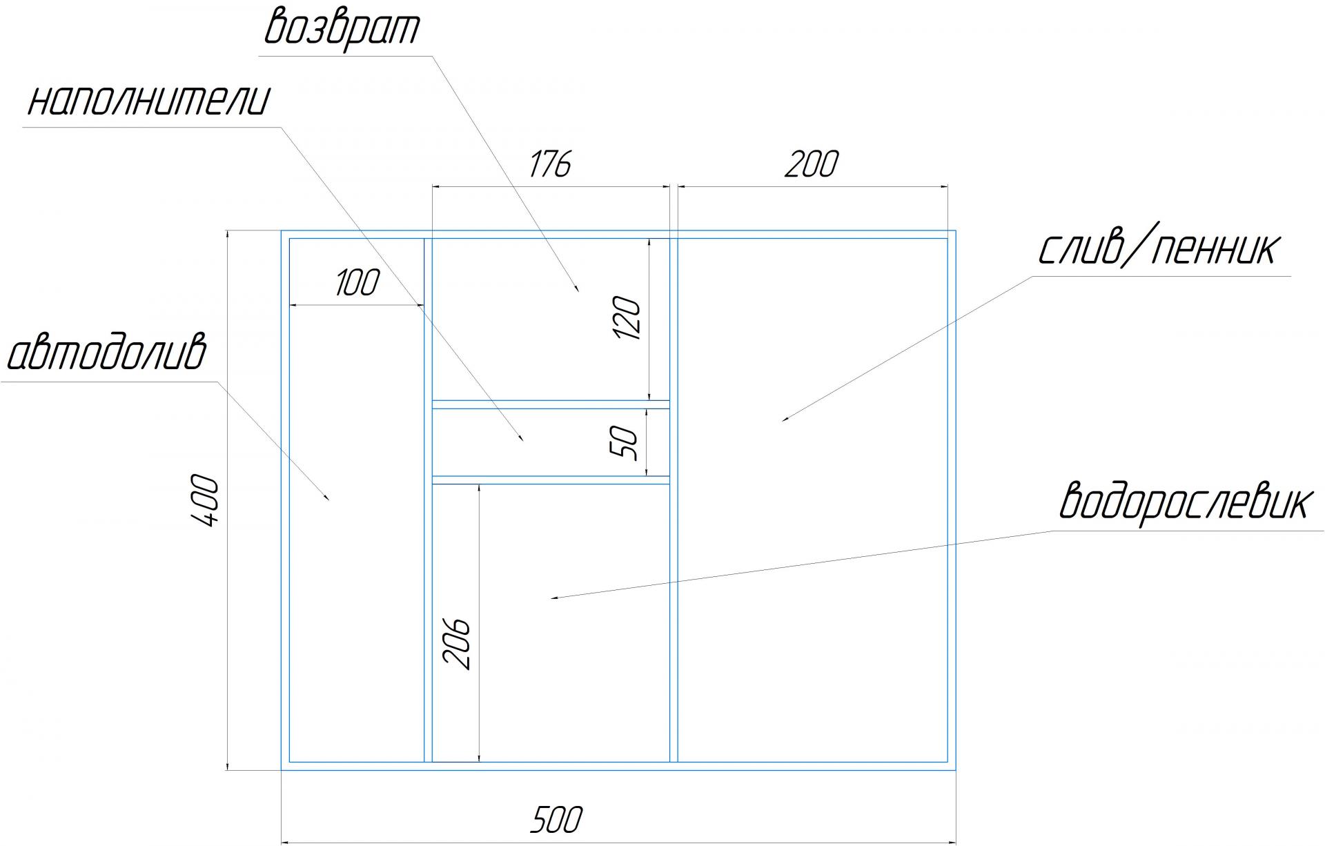 Тумба на металлическом каркасе из профиля 40Х20 с порошковой окраской, обшита ЛДСП, высота тумбы 85 см, имеются регулируемые опоры. В тумбе имеется сухой отсек где удобно хранить электроприборы и аквариумные принадлежности. В отсеке с сампом, имеющещем размеры 500Х400Х400 мм., имеется удобная панель, на которой удобно размещать контроллеры от оборудования.