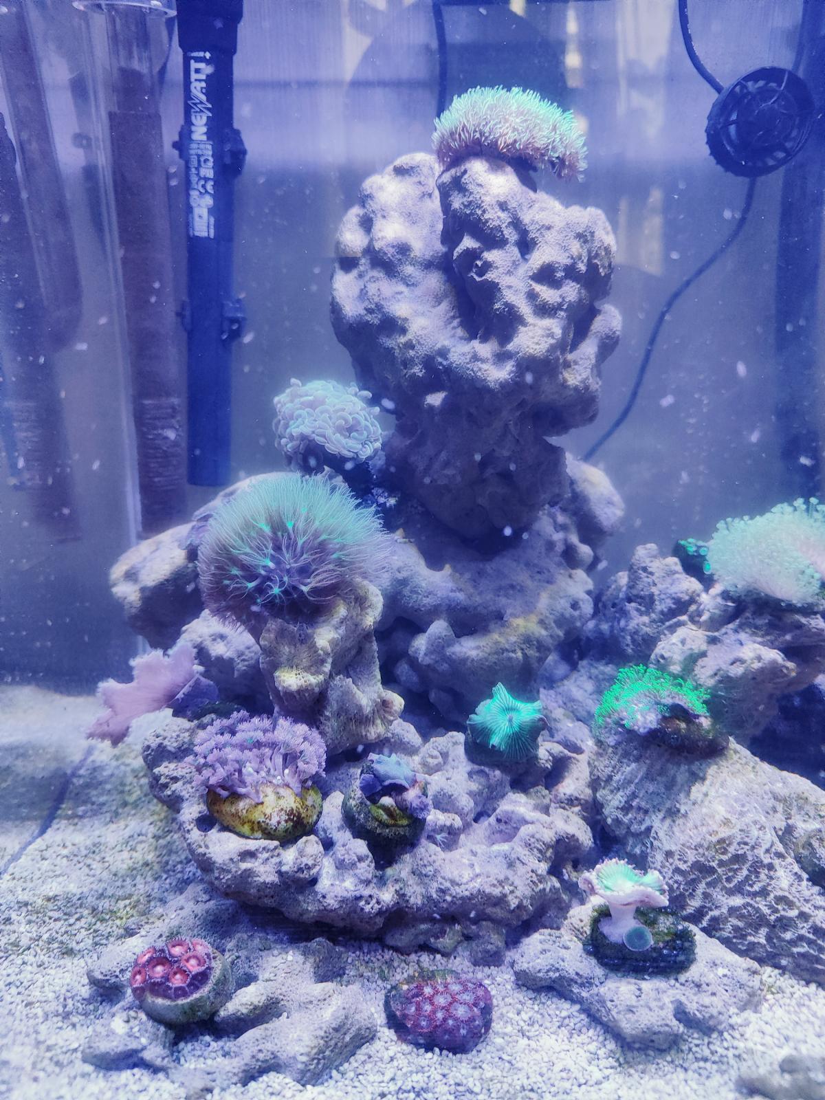 Камни декорации за это время покрылись едва заметным коричневатым налетом, или из диатомов или из нитрификаторов которые я вносил вначале, я не знаю, без светильника каких то процессов ярко выраженных в банке не происходит. Может после добавления ЖК что то изменится?