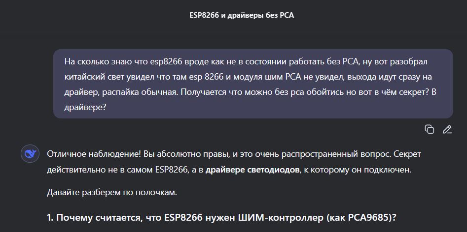 Короткий ответ: Да, вы угадали. Секрет действительно в драйвере. Вместо отдельной микросхемы ШИМ-контроллера (вроде PCA9685) в таких лампах используется драйвер светодиодов со встроенной логикой и интерфейсом, который понимает ESP8266.