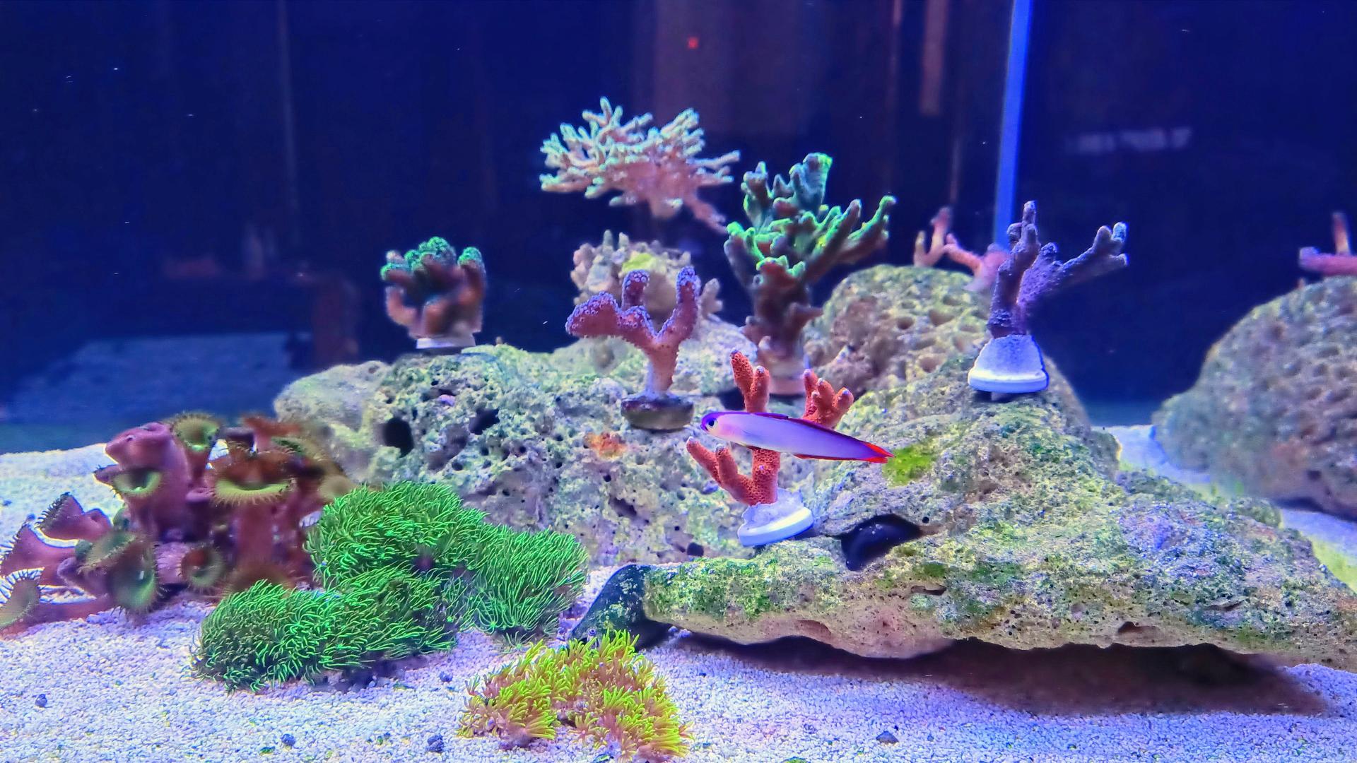 Месяц после запуска. Население пока что скудное. Несколько видов мягких кораллов, собачка сфинкс, пара мальков кефали, черноморские креветки, пара улиток, отшельники и пара конских актиний.