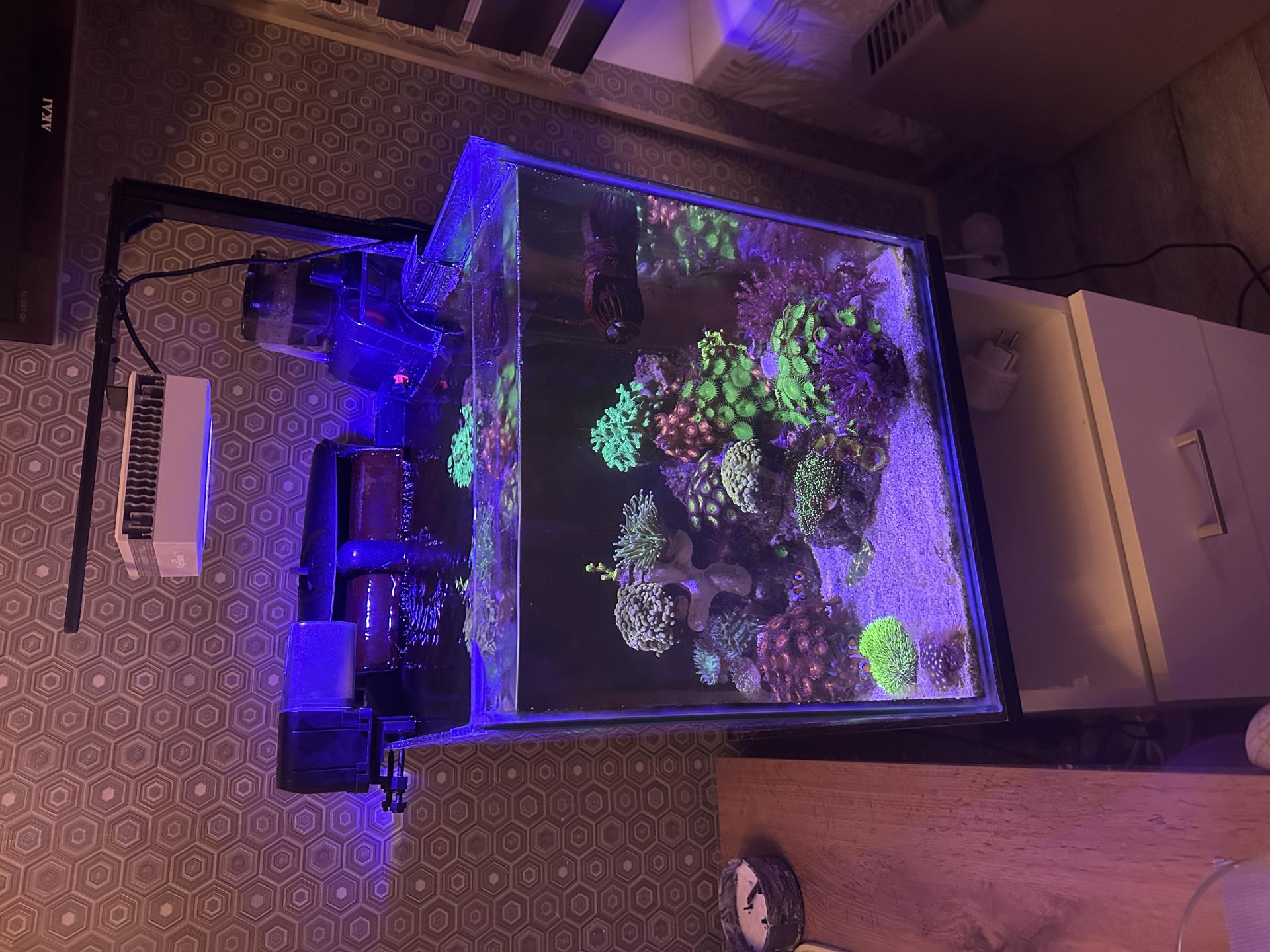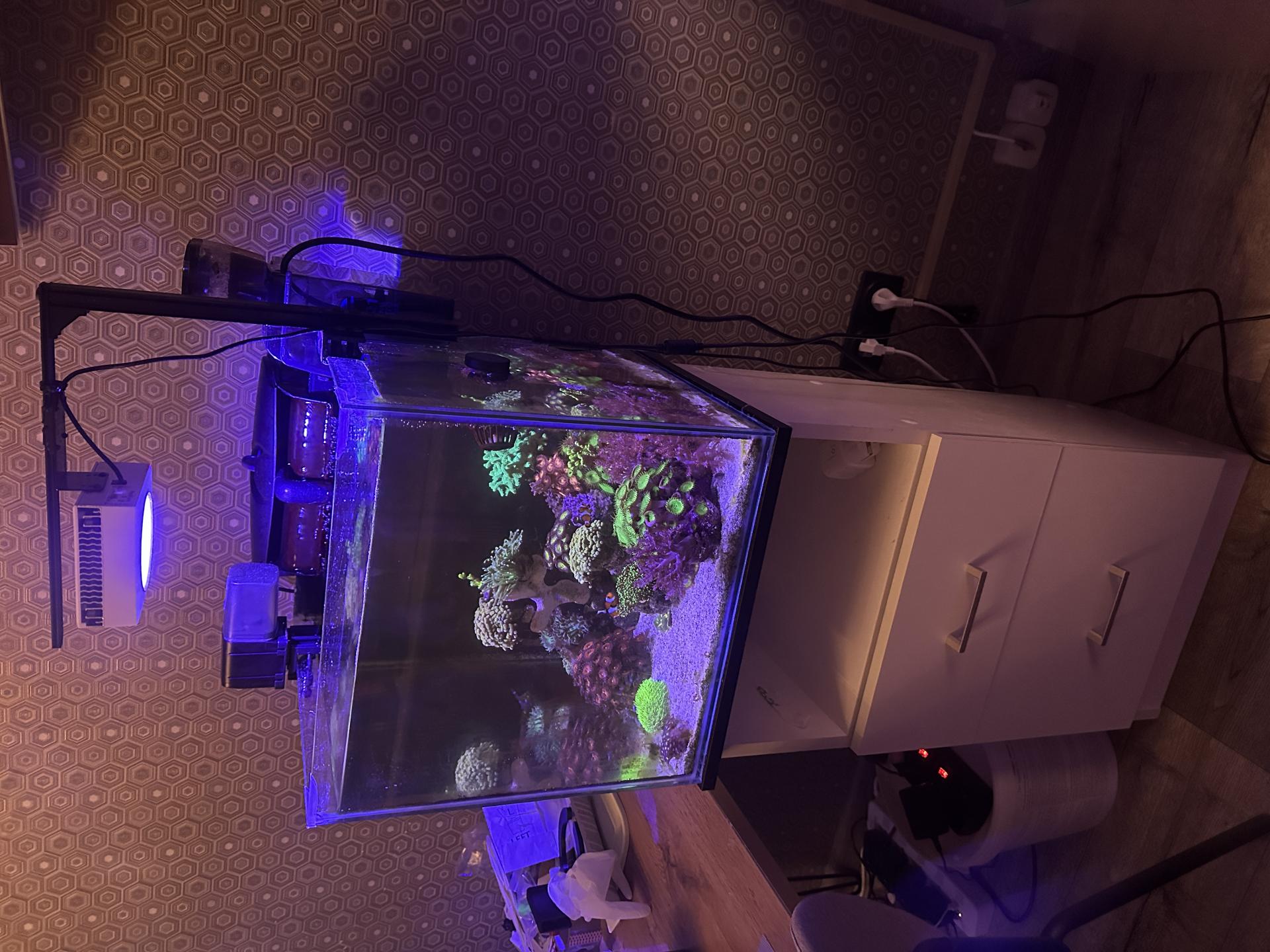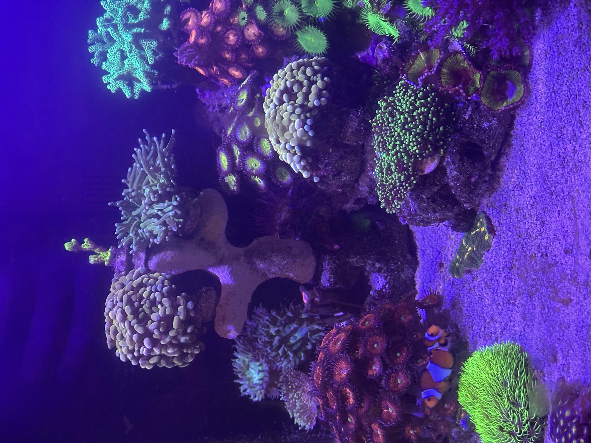 Население - 2 клоуна, кораллы эуфилии ветвистые, эуфилии факельные, чалис, анемоны, календрум, милка, зоантусы, политои, живые камли и тд