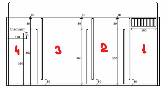 1 шахта приёмная ~8×10×35(выс)см; из приёмной через них во 2-ю шахту до переливной перегородки ~8×17×35(выс)см; из переливной в 3-ю шахту переливная(я так назвал) ~8×4×25(см); из перелива через низ в возвратную шахту 4-ю ~10×10×35(выс)см
