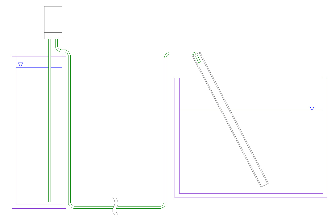 У меня так выглядит. Бак выше сампа, стоит в кладовке. Помпа маленькая диафрагменная. Трубка осмосная, ПЭ 1/4". В сампе стоит наклонно труба ПВХ 16 мм, в неё заведён конец трубки от помпы.