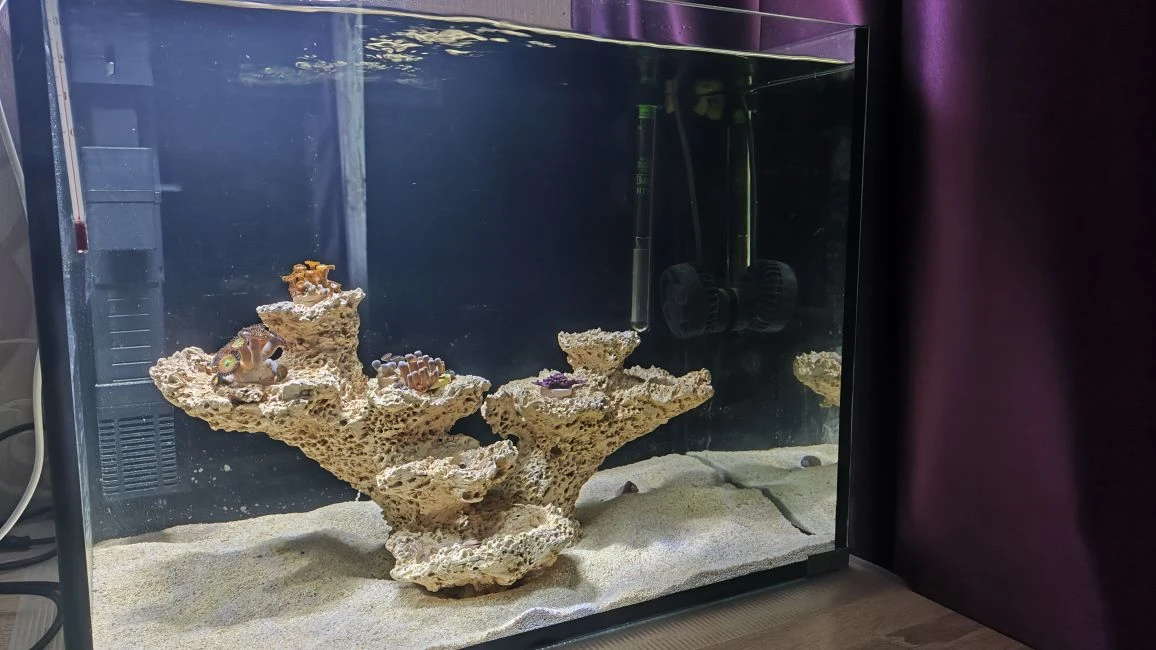 Население сразу - маленькая актиния, плашка зонтов, два маленьких саркафитона, 4 маленьких улитки. Поначалу (2 дня) всё было бодро, сейчас актиния еле живая, уменьшилась с размере сидит на одном месте, потемнела, а первые пару дней носилась как ненормальная по банке. Остальное лучше, но улитки то же стали вялыми, не понятно, что не так.
