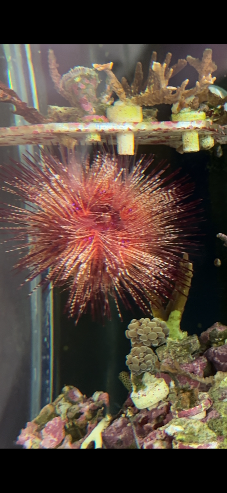 Еж astropyga radiata размер тела 5-10см с иглами 15+см хорошо перекапывает грунт ест обрастания со стекл, обожает Каролину, замечен в обгладывании инкрустирующих кораллов но по чуть чуть