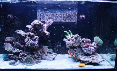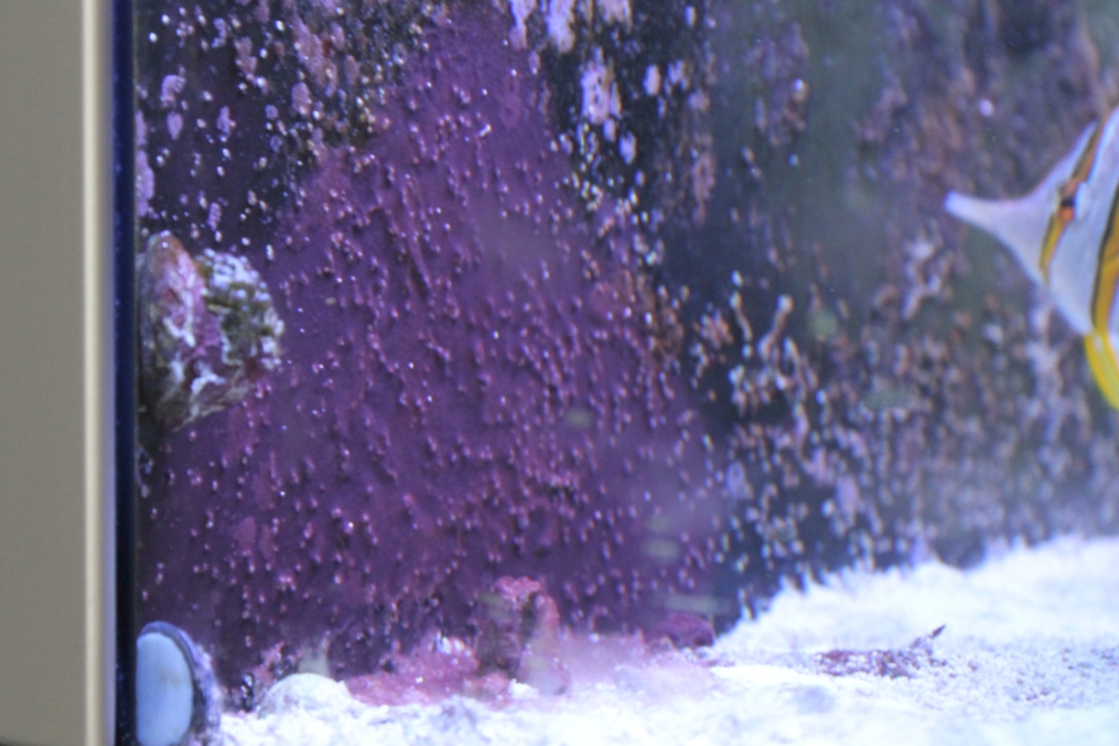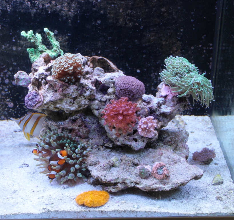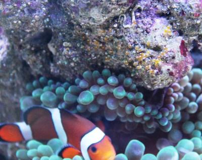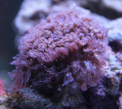 Акропора свою начальную бирюзову окраску потеряла, зато наросли фиолетовые кончики. И юбку по второму разу наращивает. Она из всех спсов быстрее всех растет.