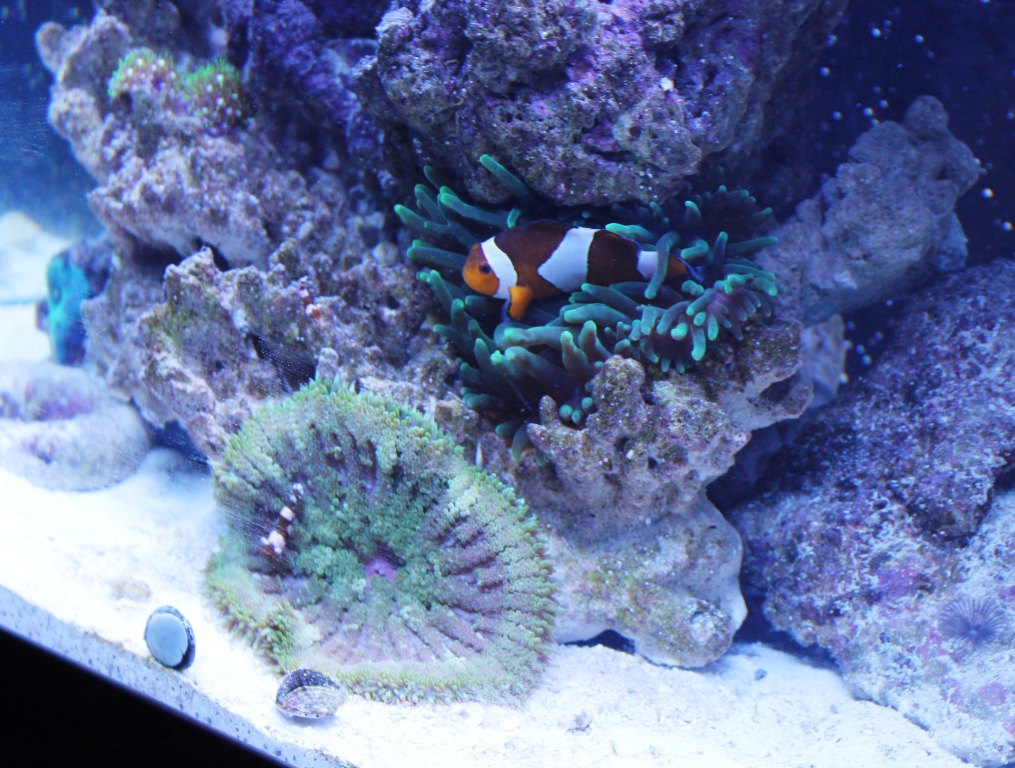 Итог моего наезда на Витин аквариум: один клоун-сирота (третий он был у Вити, обижали его), а в приданое клоуну две актинии (Яна права, ногтиком отковыриваются только так), кустик поцилопоры и фраг неведомой акры, кусочек листовой монти зелененькой, красивая кислотно-зеленая эуфилия, куча грибочков всяких разных... Вчера полночи ковырялась в акве. Глобальная поклейка завершилась таким образом: