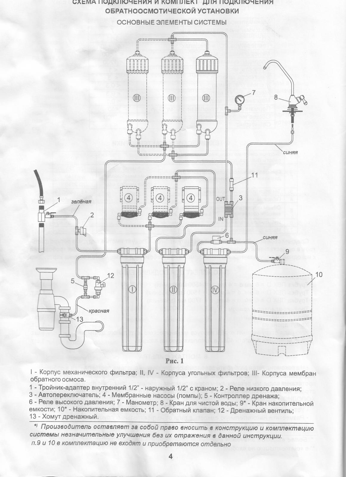 Следует обратить внимание на работу автопереключателя (3). Он перекрывает поток воды на мембрану при высоком давлении (> 2 атм) на выходе с него на накопительный бак. Это давление создается в первую очередь за счет накопительного бака, который мы не ставим. В конкретной модели фильтра необходимое для закрытия клапана давление создается за счет давления в корпусе фильтра «IV». В других моделях фильтров, где нет дополнительного корпуса фильтра, после выхода с мембраны автопереключатель может не работать. Проверить это очень просто. После перекрывания крана (