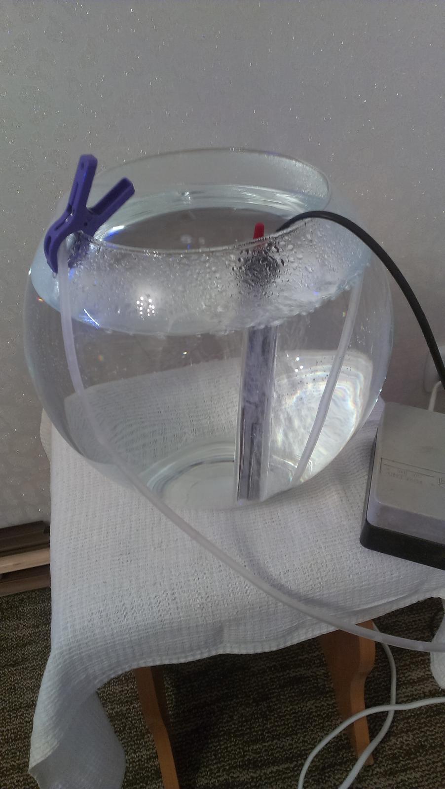 В карантиннике установила водонагреватель, свет, термометр, скиммер ( чтоб остатки еды ликвидировать быстрее ), температура воды 26, соленость 1,023, немного ниже чем в основном дисплее ( 1,024 ), пвх труб в доме не оказалось, поэтому для укрытий положила несколько керамических чашек, до завтра.