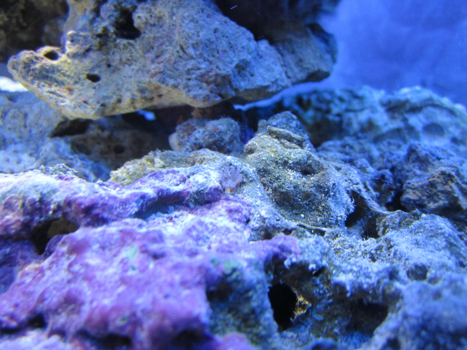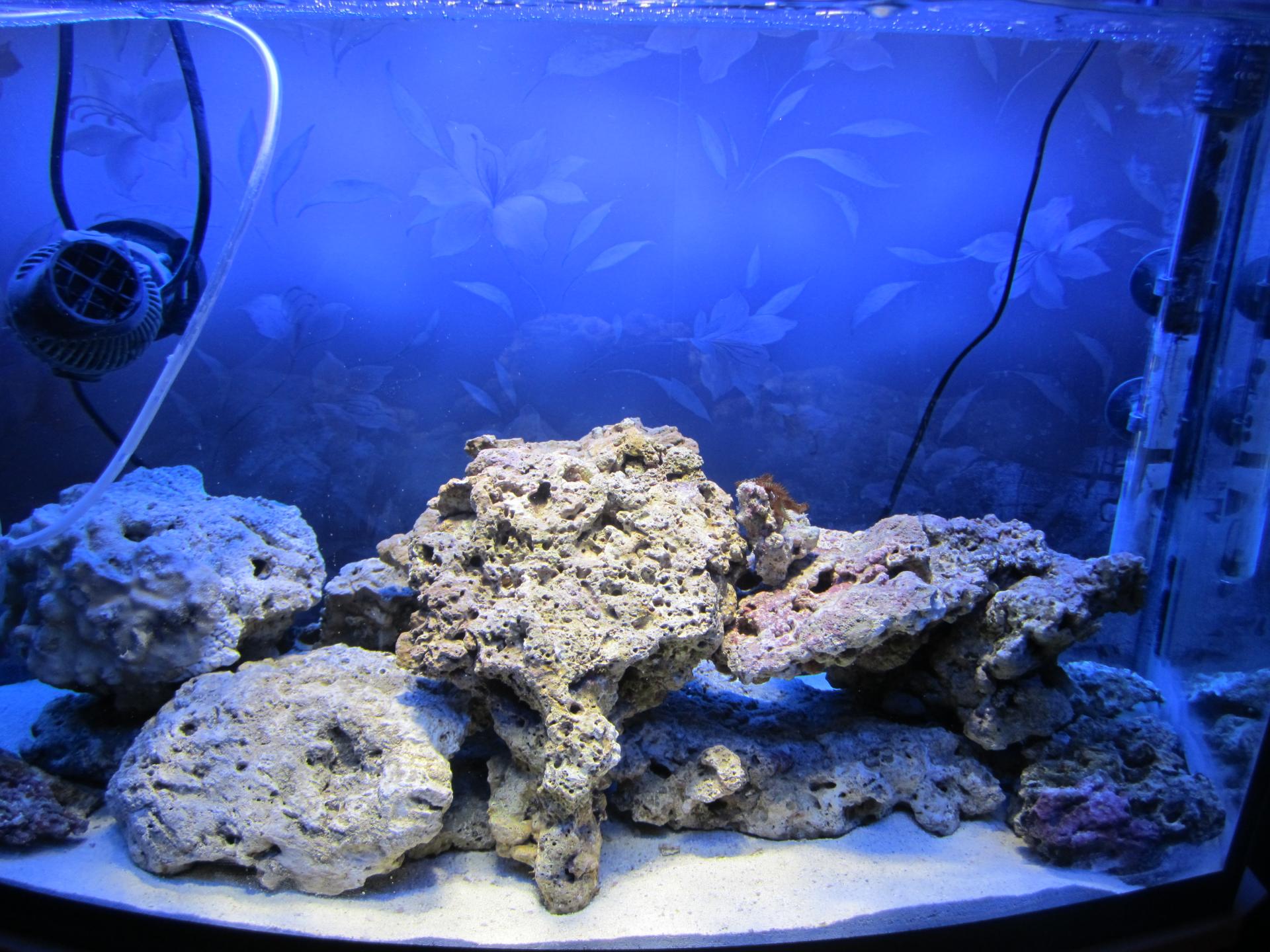 Заложили 16кг камней. Будем досыпать коралловую крошку мелкой фракции 5кг. Класть на дно решетку и заново укладывать камни. С камнями попались трубчатые черви, краб(прячется в отверстии камня),айптазия (которая после кипятка не появлялась больше), какая-то серо-бежевая многоножка 5-7см, улитка 2мм бело-желтая с маленькими точками, каулерпа (сразу же была сошкрябана), какие-то мелкие 5мм тараканообразные букашки, двустворчатые моллюски, ксения. Больше пока никого не нашли, но думаю, что живности там еще не мало прячется. Посажены зоантусы. Проблем с плохим самочувствием ни у кого не наблюдается.