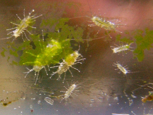 Здравствуйте! Сразу после запуска на стенках было множество мелких (около 1мм) белых с хвостиками каких-то "жучков". Они бегали по стеклу, очень быстро передвигались. Сейчас их не видно, но сегодня на стекле был обнаружен вот такой сверчок. Размер - около 1см с усами. Есть подозрение, что это тот мелкий вырос - но, возможно, это разные звери.