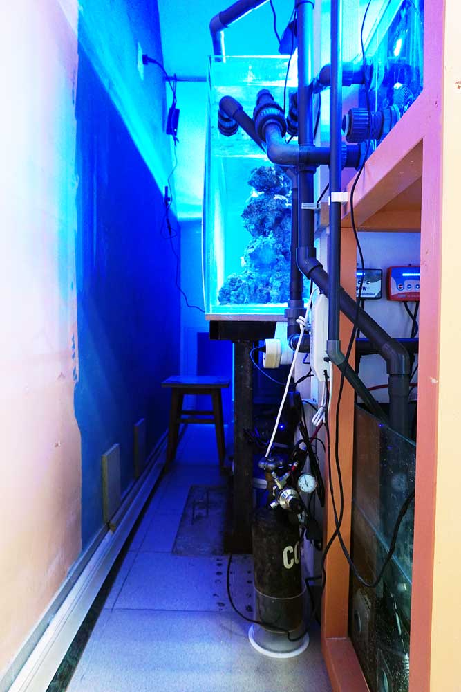 ) теперь не полторы тонны, а ровно 1000 литров. Я убрал одну стойку с сампами. Вторую поставил к другой стене так, чтобы не перешагивать через трубы. И убрал из водооборота верхний ярус. Там теперь емкость автодолива. Такая перестановка принесла свои плюсы. Вода из дисплея попадает сначала в емкость-"фраговик", а оттуда вниз на первый ярус, где стоит пенник и остальное оборудование. Отпала необходимость в дополнительной помпе, обслуживавшей три яруса сампов.
