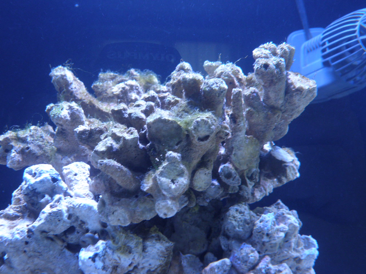 Бурый налет на камнях и на песке потихоньку проходит. Зеленые водоросли, похожие на вату продолжают расти на самых освещенных участках «моего рифа». По совету бывалых акварюмистов, больше я их не обдираю зубной щеткой.:-) На стенках стекол появились какие-то маленькие, белые «животины» похожие на блох, только еще мельче. Чего это-не знаю!