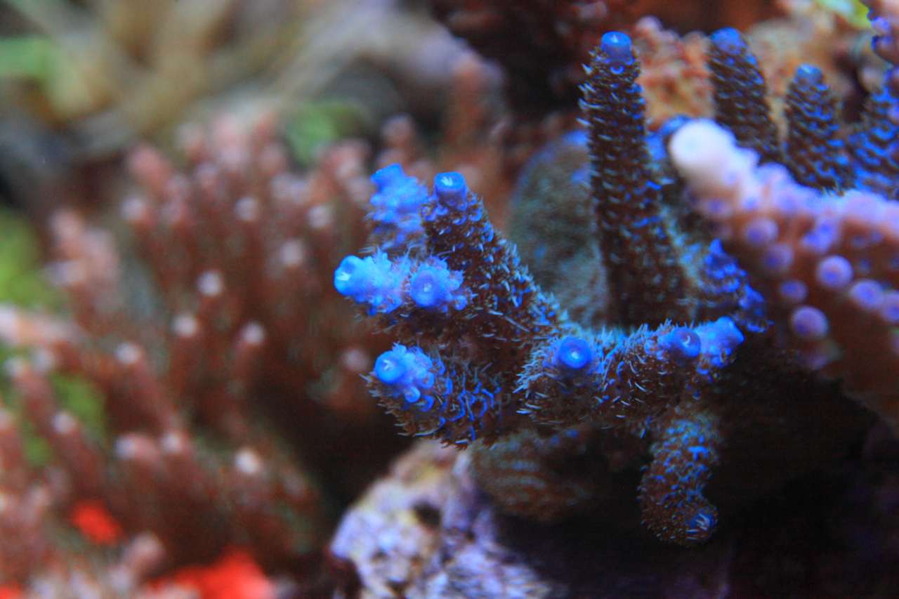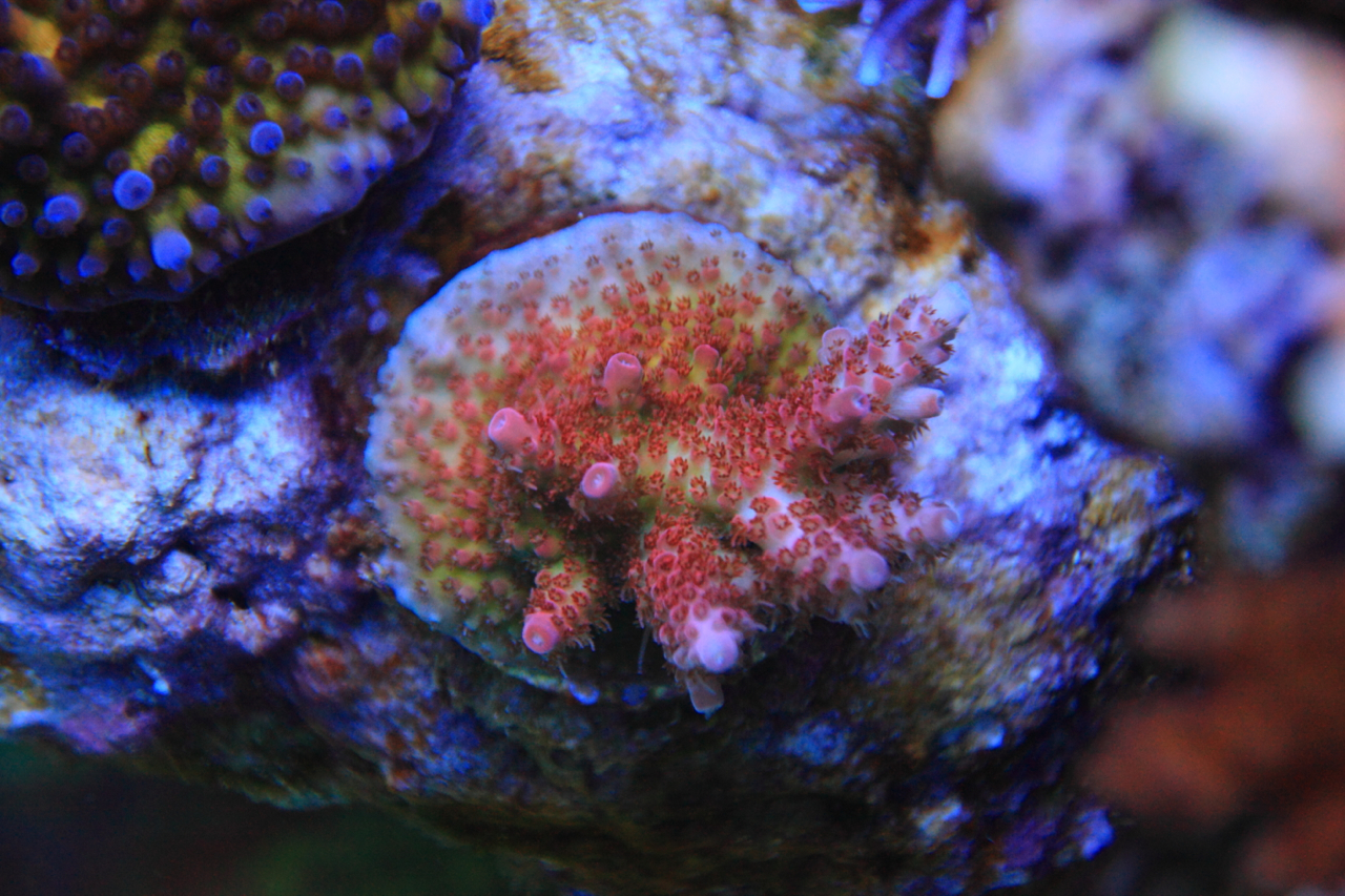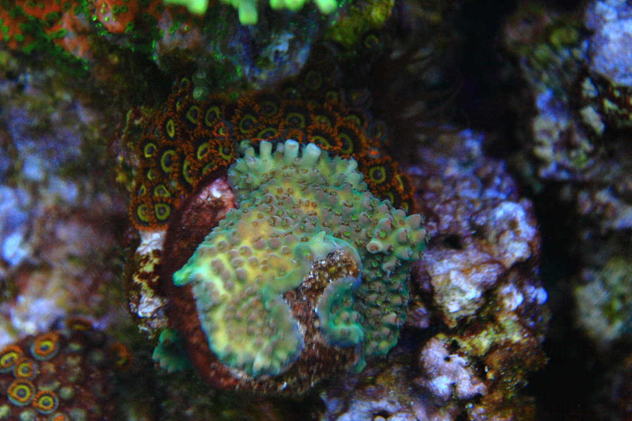 Она отдельно, и видимо ей там нравится, так щупальцы пошли расти. У меня четыре гониопоры рядом, а три другие в противоположном углу по диагонали. Снача я просто их убирал подальше от СПС, а потом встретил одного китайца, который еще в те времена, когда гониопоры дохли в аквриумах, растил их без проблем. Меня шокировало, как он их фраговал: взял нож, обмакнул его в воду с хлором и разрезал, как арбуз.)))))) Вот от него я и получил все рекомендации по гониопорам, так как потерял все свои гониопоры в 2012 году.