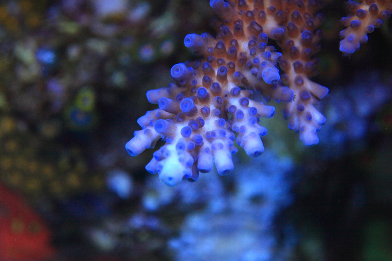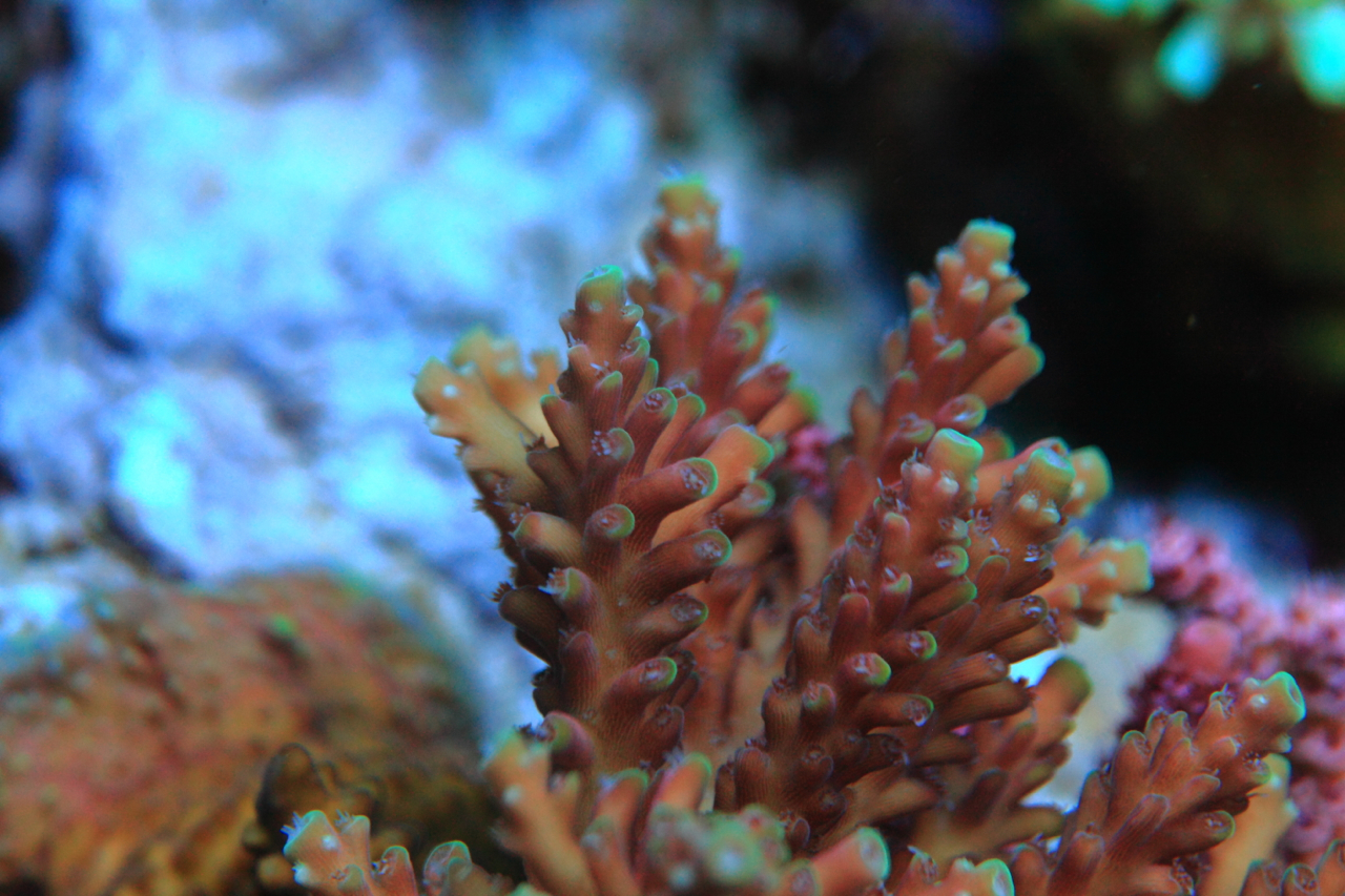 Как раз течение им нужно, а вот свет они не любят. Все мои гониопоры стоят за лампой. Специально для них у меня аквариум 160, а лампа 120, с каждой стороны я оставил 20 см без света.