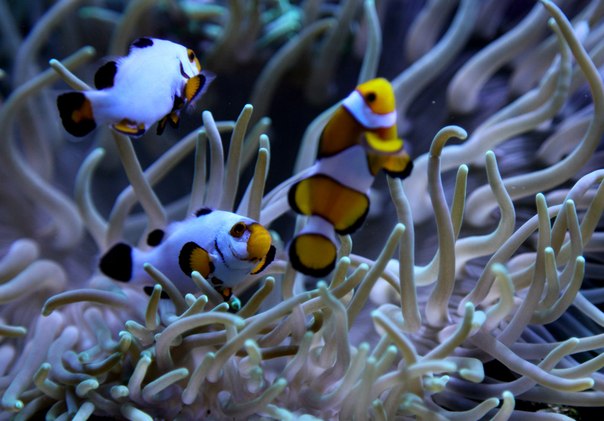 Черные - не знаю, дикари, или нет(скорее, все ж разводные), попали ко мне от друга, который их в свою очередь получил от кого-то при расформировании аквариума. Живут в отсадном аквариуме, "помойке", как я его называю, туда скидываю обломки кораллов, и туда же сумел отловить 2 актинии (мои в аквариуме основном часто делятся). Эти клоуны -в актинию сели тут же, на второй день, причем самка в большую, а самец в маленькую, которая чуть-ли не меньше его самого.