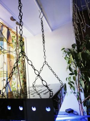 Кратенько о "люстре". 50 см длиной. Черный акриловый корпус. На подвесе (цепи). Цепи кстати сделал не на крюки в потолок а на штангу от душевой занавески (у меня аквас в проеме оконно-дверного блока на лоджию стоит). Так что теперь при необходимости занырнуть в банку светильник можно отодвинуть вбок, как занавеску