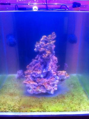 С первых дней запуска был включен свет на 50% в режиме sps/lps . Появлялись дитомовые, бурые,циано. Все стандартно. Затем все камни очистились, дно тоже.