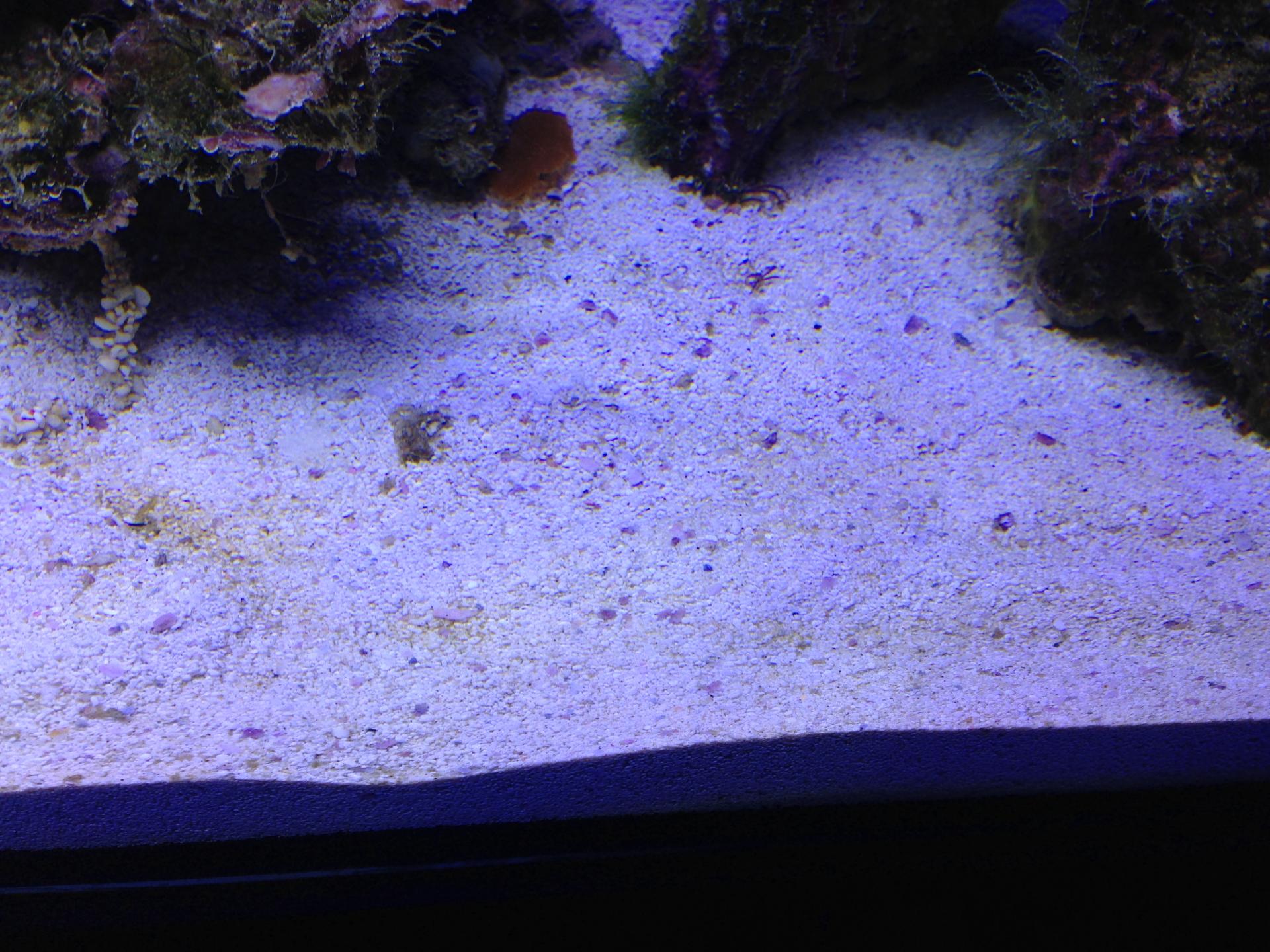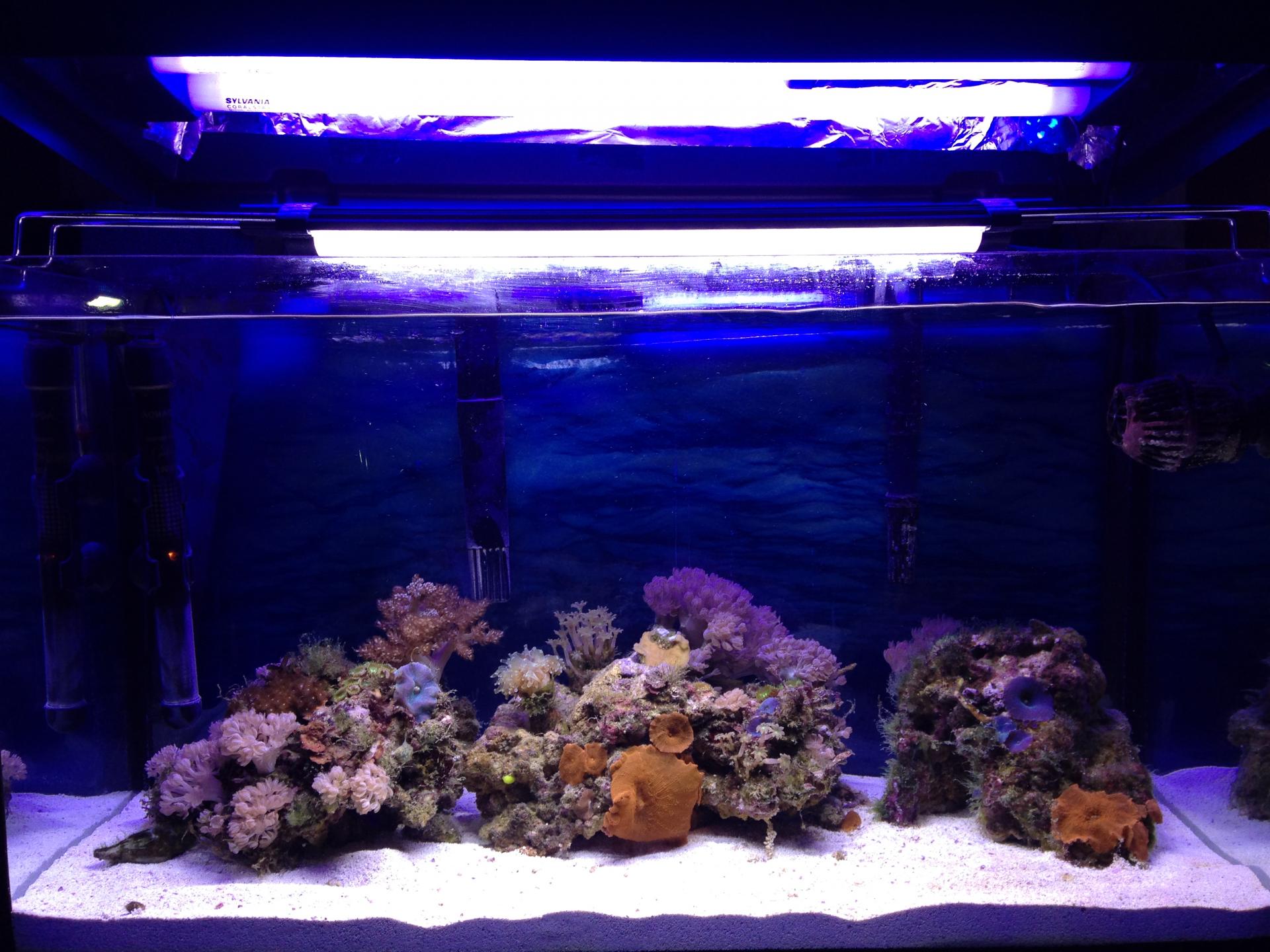 Сейчас всё отлично, песочек белый, больше ни каких вспышек водорослей не было, а кораллы чувствуют себя намного лучше чем в старой банке, даже стали расти и окрашиваться. К своему лед светильнику добавил в крышке две актиники т8 и всё стало супер, тьфу-тьфу-тьфу. Сейчас жду поставки рыбок в магазин Рифовод, чтобы пополнить свою банку. Запустил недавно креветку-боксера, а она сразу же скинула свои лапы с клешнями, жду когда полиняет, говорят отрастут.