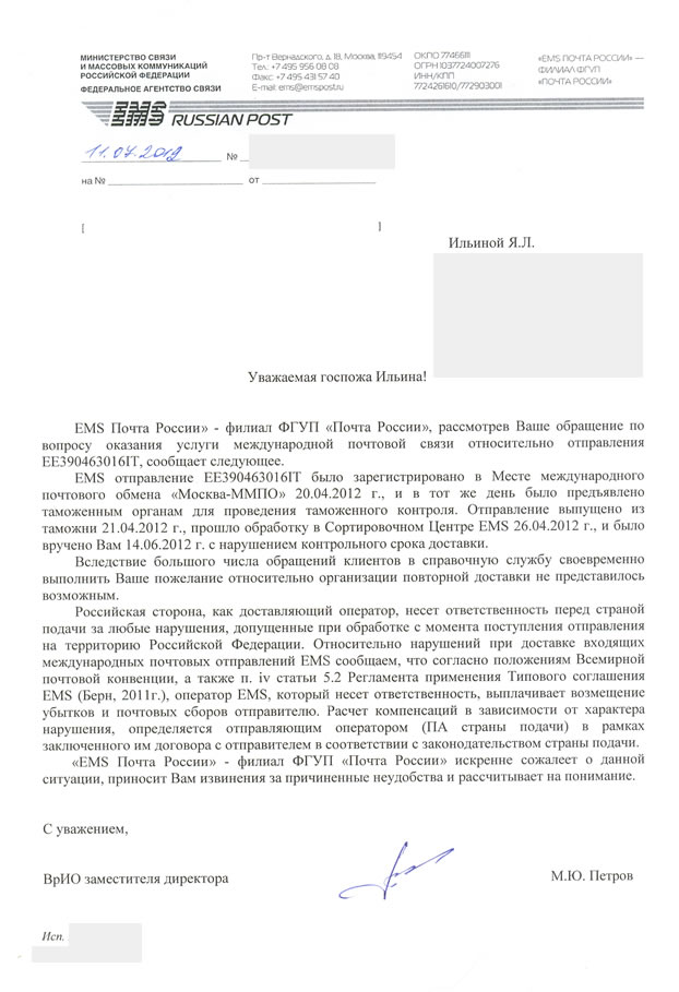 И гнездящееся где-то в сознании ощущение, что никуда ее не отправляли.. и мне не доставляли... по одной простой причине - EMS само не знает где она, и просто отписывается и отговаривается по шаблону... И, соответственно, ждать ее возвращения мы будем долго... а потом скандалить...
