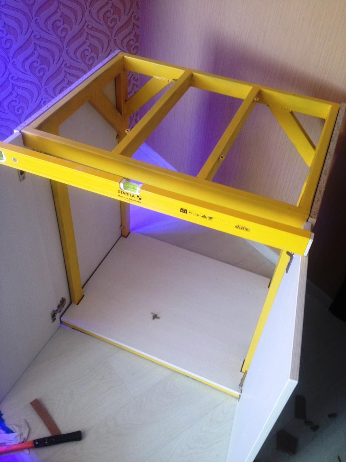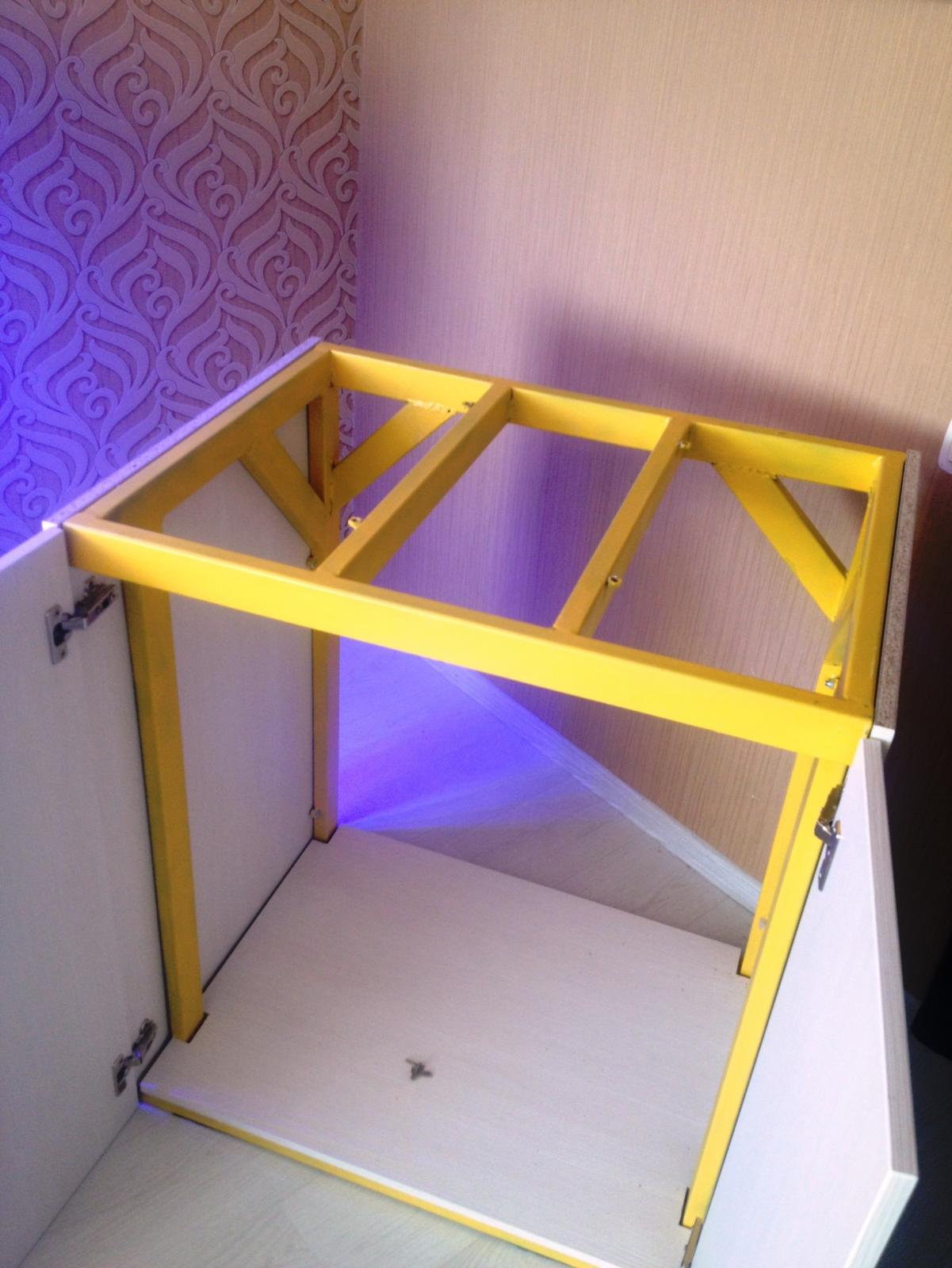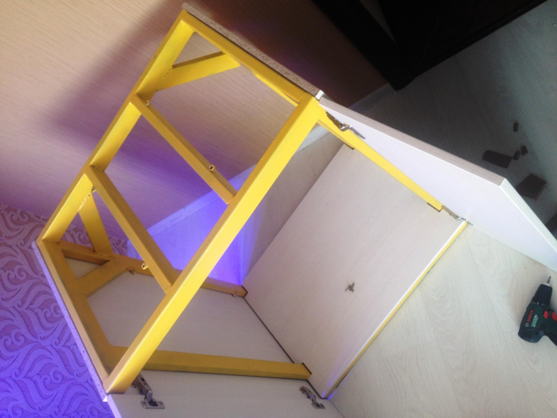 и вот настало время обшивать каркас который уже месяц как стоит свареный, закрепил столешницу, далее две боковинки и повесил двери и тут то все началось,