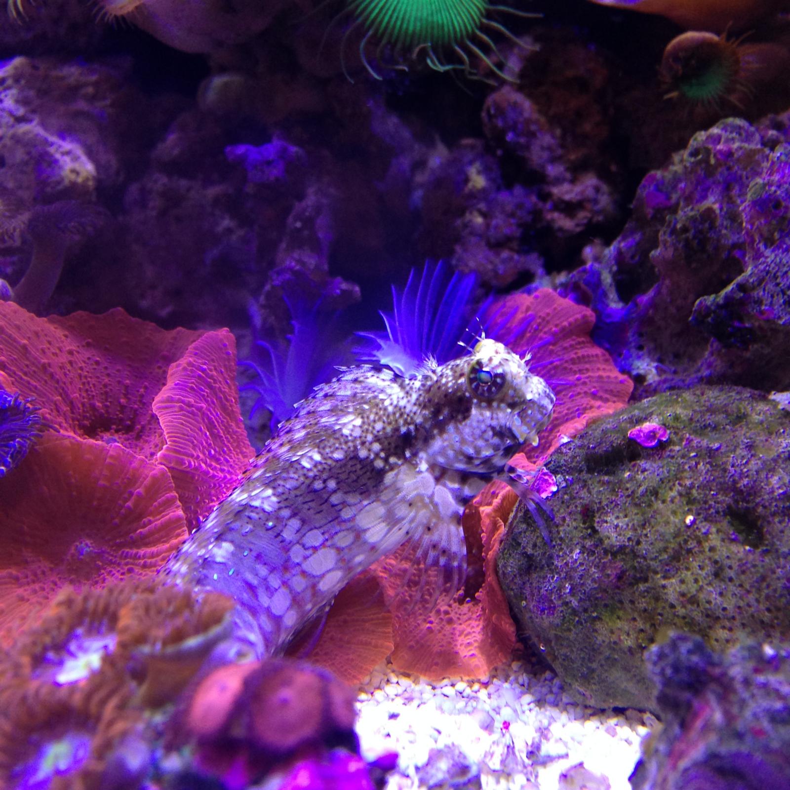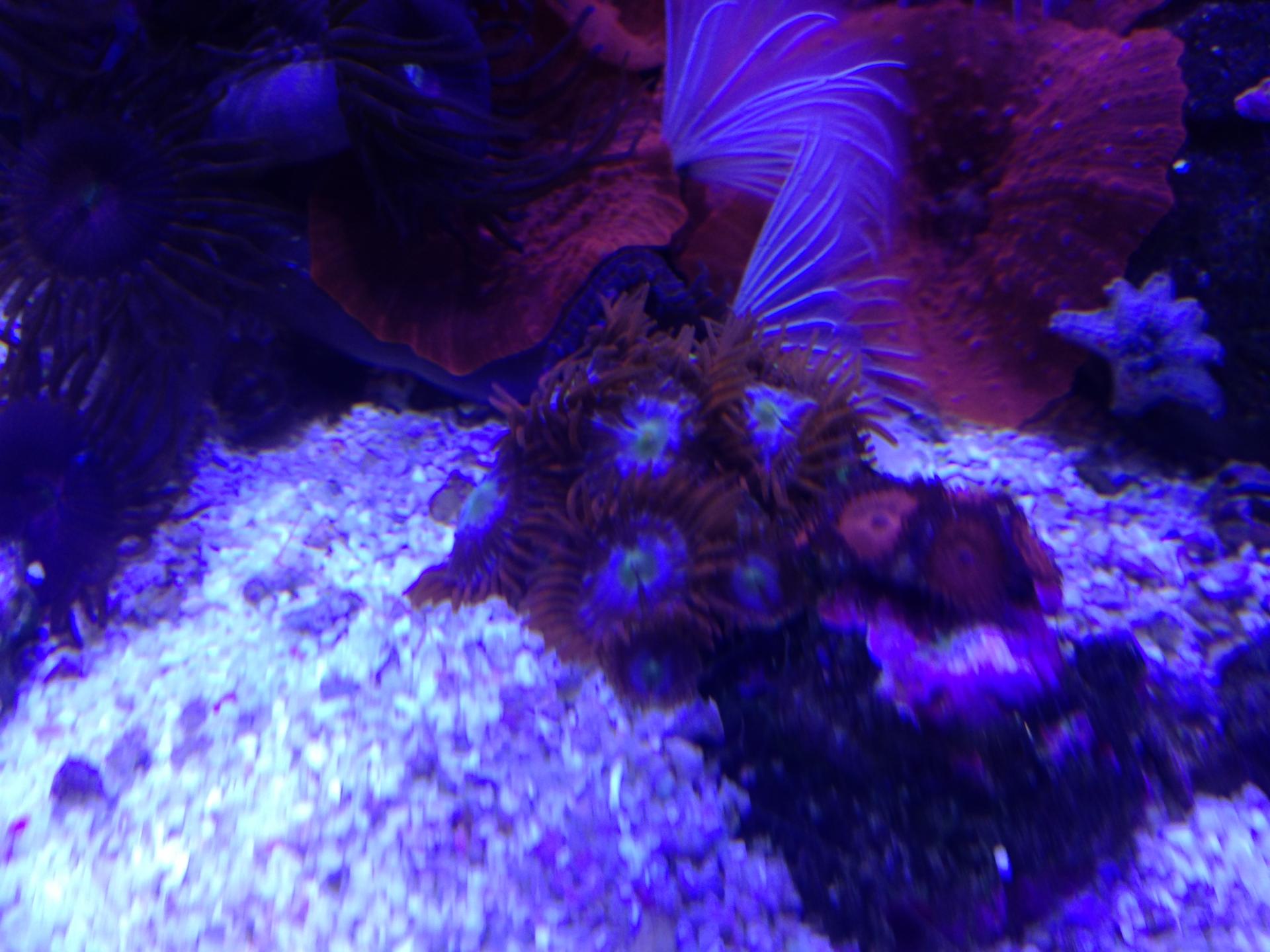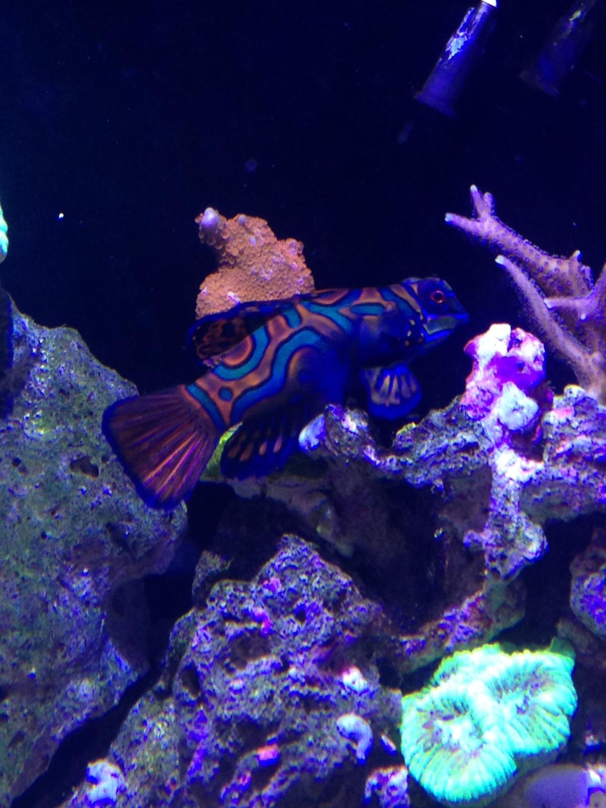 Оцики разделилсь, самка обосновалась в саркофитоне, а самец тусит над магнитным скребком. Мандарин плавает по все акве, что то подбирает со дна и с камней.