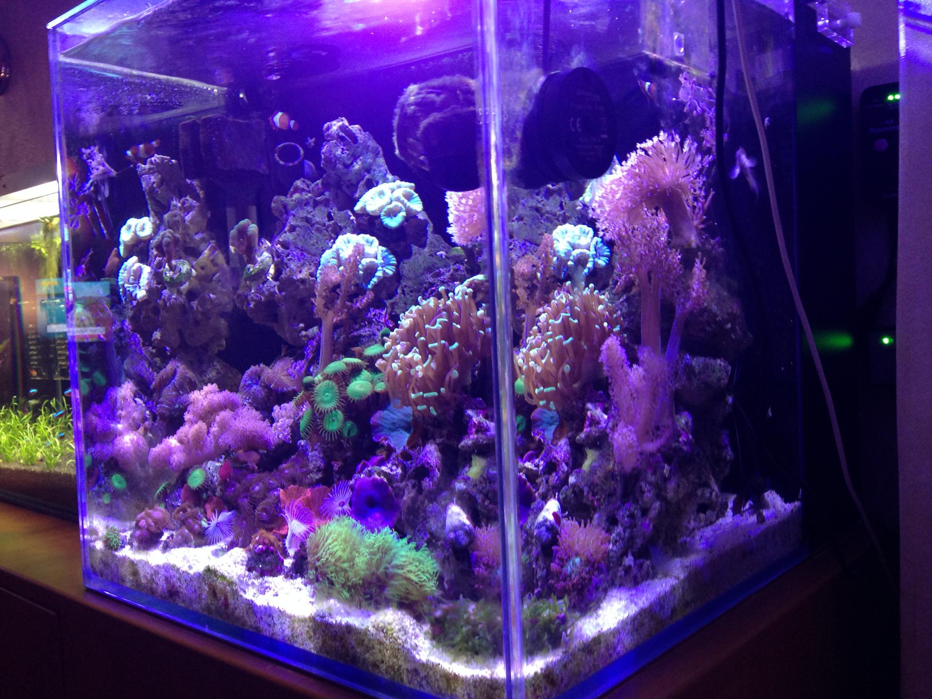 Все идет своим чередом: рыбы в порядке, кораллы цветут и немного растут. Прирастил три куста ксении на заднее стекло, прикольно смотрится