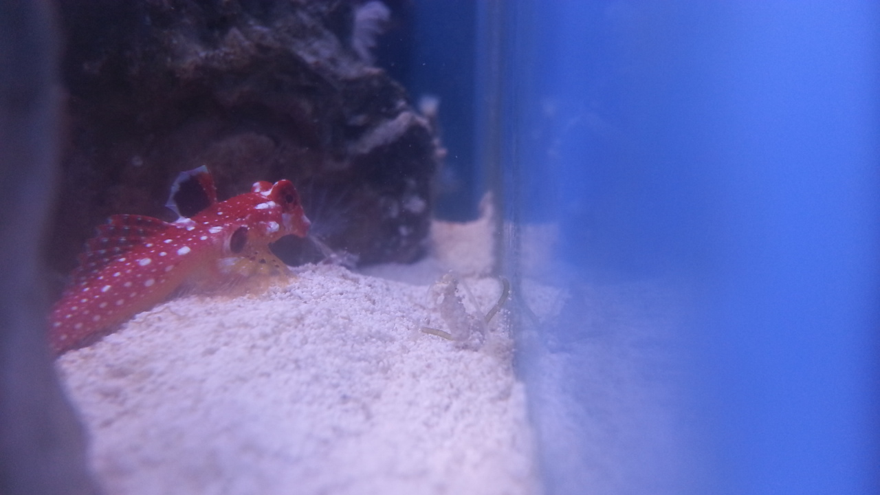 Сегодня вечером заметила отсутствие мандаришки, обычно снующей всегда по камням. С фонарем я час исследовала все уголки рифа, даже умудрилась засунуть голову между стеной и аквариумом