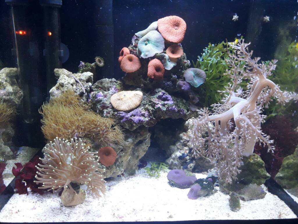 А фунгию лучше на песок в центр положить(имеют свойство передвигаться и может упасть с камня), а креветку перекинуть в другую банку (миник).