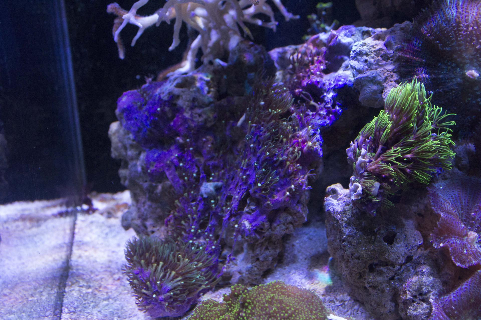 Продам ЖК, почти на каждом камне есть кораллы, песчаный анемон, грибы, родактис, клавулярия фиолетовая.