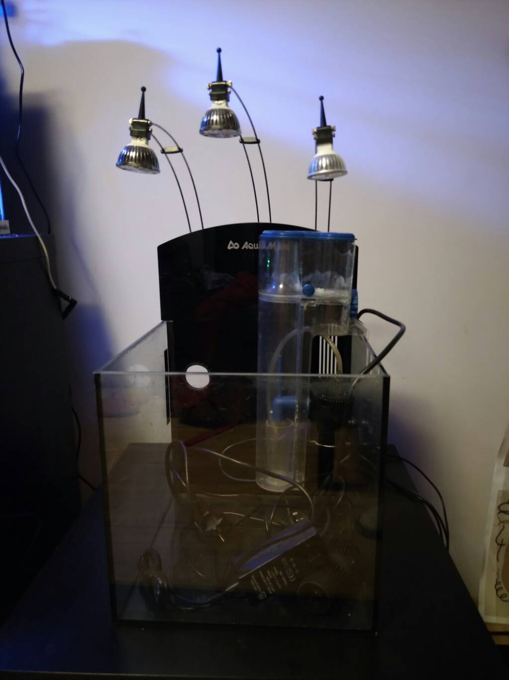 Комплектация полная: аквариум, пенник, помпа, штатный светильник. Состояние удовлетворительное, есть недочеты по стеклу (мелкие царапины от песка). Техническое оснащение в полностью рабочем состоянии, во флотаторе установлен новый импеллер. В светильнике не работает одна лампа и потерян блок питания. Но свет в любом случае нужен другой, родной откровенно слаб.