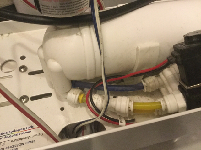 Павел! Давайте попробуем так: согласно Вашего фото и сопоставляя с 10-ой страницей инструкции по установке системы ОО SpectraPure https://spectrapure....s/MC_MANUAL.pdf, полагаю, что рестриктор у Вас - в зеленой трубке (согласно инструкции он либо красный, либо зеленый), которая идет от датчика к двойнику ( Ваше фото №4). Отсоедините зеленую трубку от двойника, направьте конец в емкость, "включите" систему ОО и убедитесь в выходе воды через него. Если течет - засеките время (например 15 мин) и наберите параллельно воду после зеленого шланга и очищенную, в разные емкости для сравнения объемов.