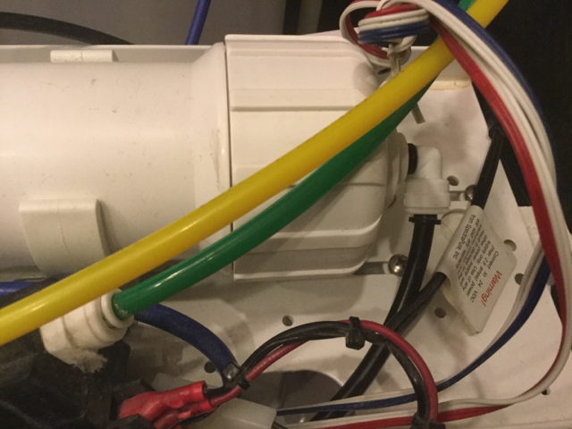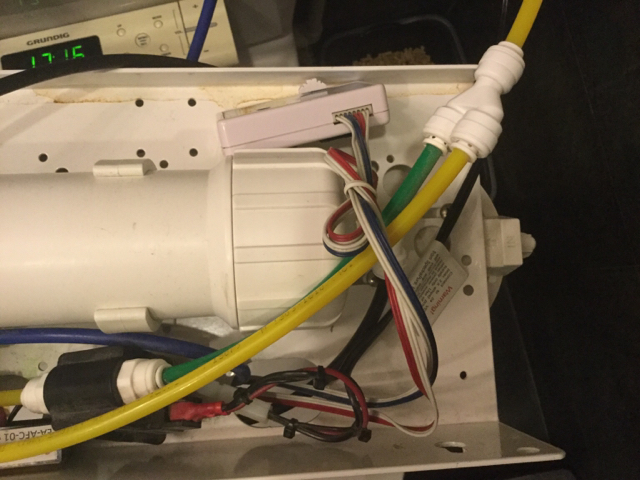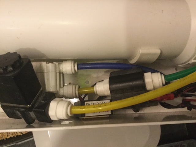 Допустим, что вода не течет. Тогда отсоедините зеленую трубку уже от датчика и проверяем его на "протоку". Если через него течет - проблема в рестрикторе. Если не течет через датчик - хулиганит он, либо "отсечной" автоклапан выше по линии выхода дренажа (бывает, что они "завоздушиваются" от попадания в них воздуха при смене мембраны). Пишут - достаточно постучать по нему во время работы и проблема пропадает... не знаю. Будем думать дальше.