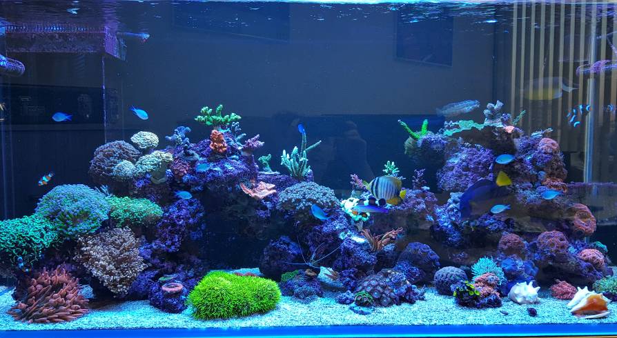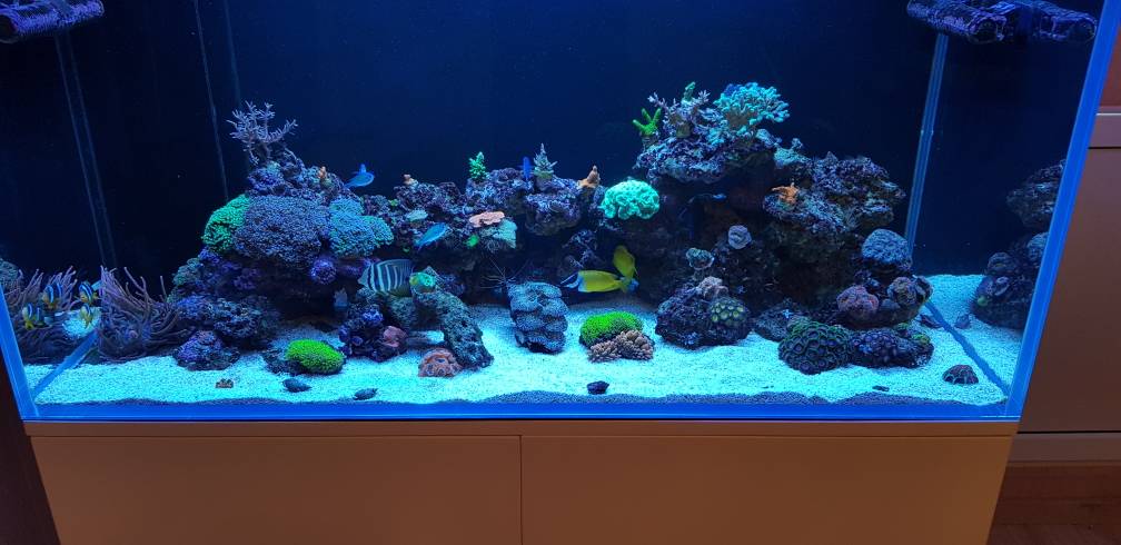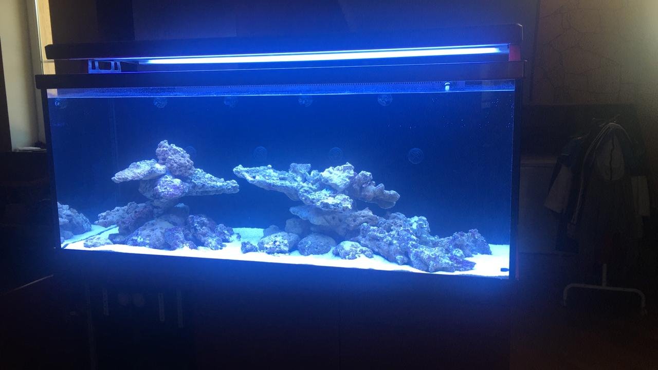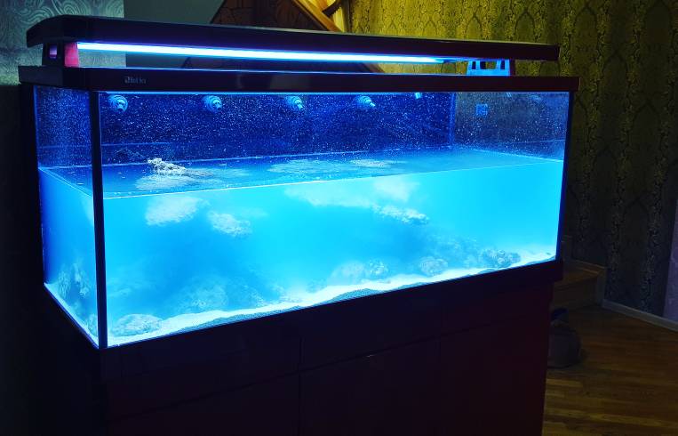 Фото правда не передает обьема. Получилось круто. Камни были хорошие и много. Было из чего выбрать. Среди камней было три больших плато. Они и послужили базой для верхушки рифа. Площадка большая получилась. Засадим ее акропорами. Соль в этой банке тоже тропик марин. Света много( 8×80 вт+диоды.) Скиммер родной. 800 литров мощность по воздуху. В дальнейшем возможно заменим. Посмотрим на нагрузку.