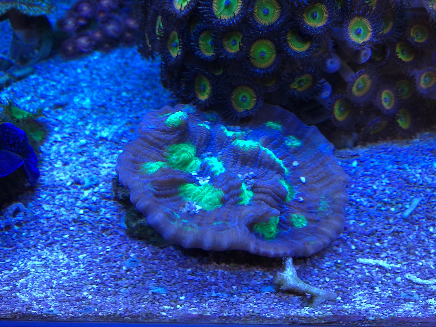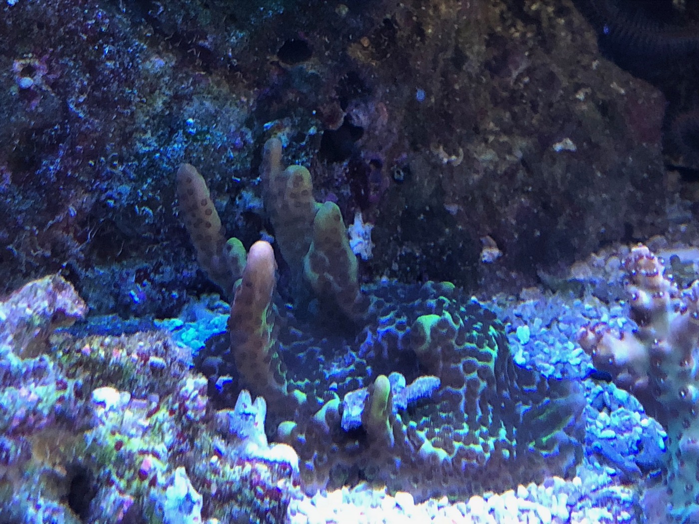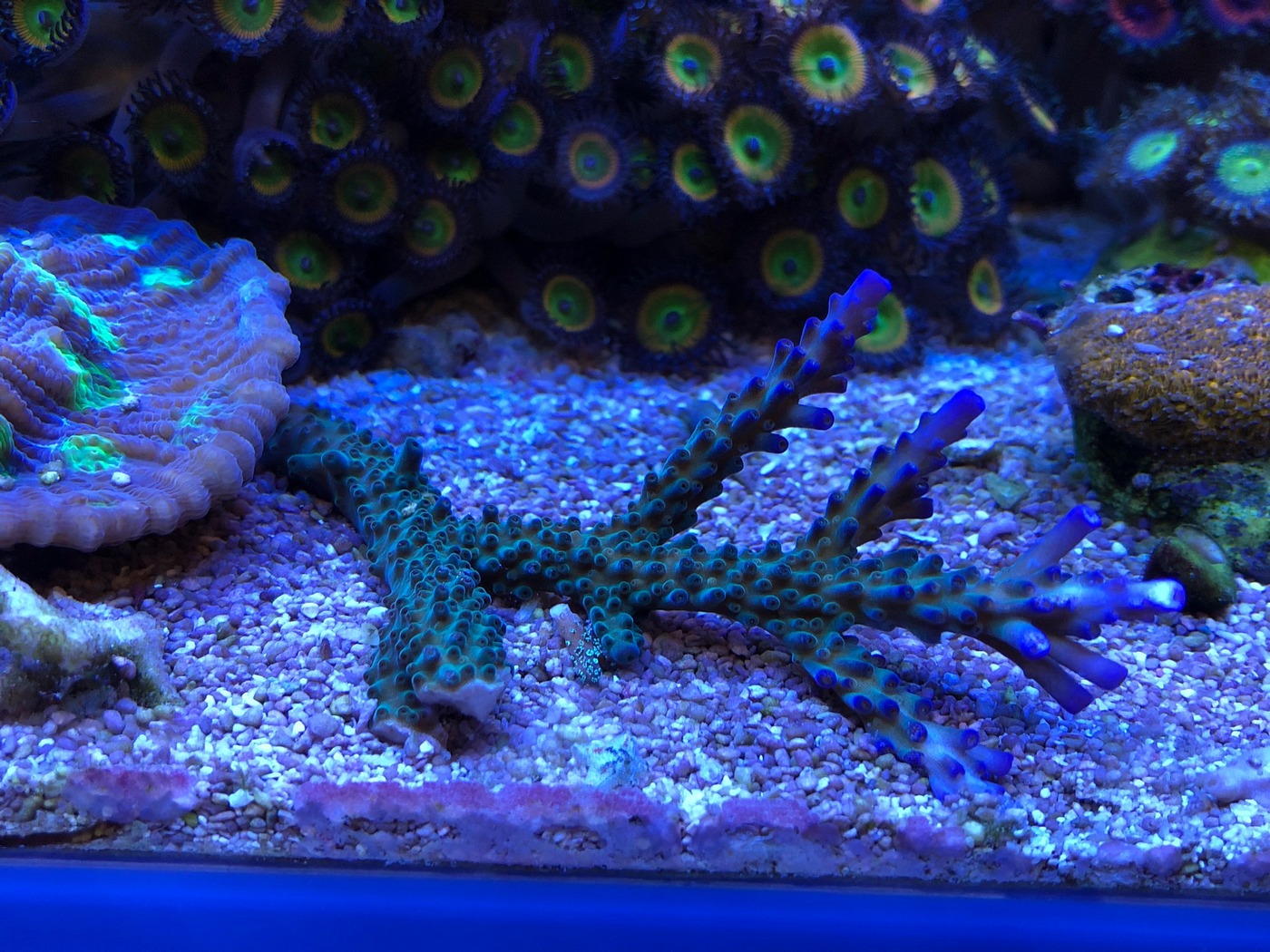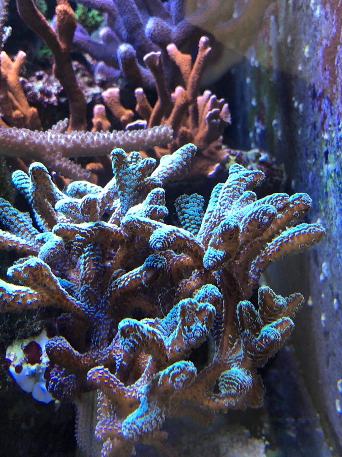 Акропора биколор. На втором фото она слева. Плюс небольшой фражик от куста правее биколора.