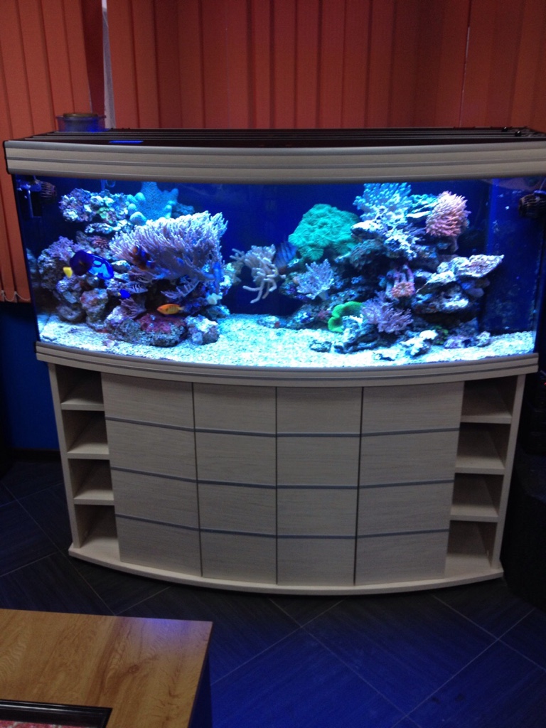 А это ваш аквариум. Этот аквариум на 700 литров. У меня точно такой же цвет и форма только на 300 литров. Сейчас стоят два светильника светодиодных и они сильно не греют да и на покрывных крышках есть отверстия сейчас в аквариуме 25 градусов. Свет можно переделать опять же у биодизайна, у них есть светильники для моря.В закрытой банке наверняка столкнетесь с перегревом, поэтому озаботьтесь покупкой холодильника, да и свет Вам вероятно придется менять, хотя бы на биодизайновский гибрид с т5, если посчитать затраты на такой апгрейд-будет тысяч 25 минимум(если попадется недорогой холодильник). В остальном-можно содержать в таком аквариуме мягкоту, пусть не самую яркую, но жить будет.