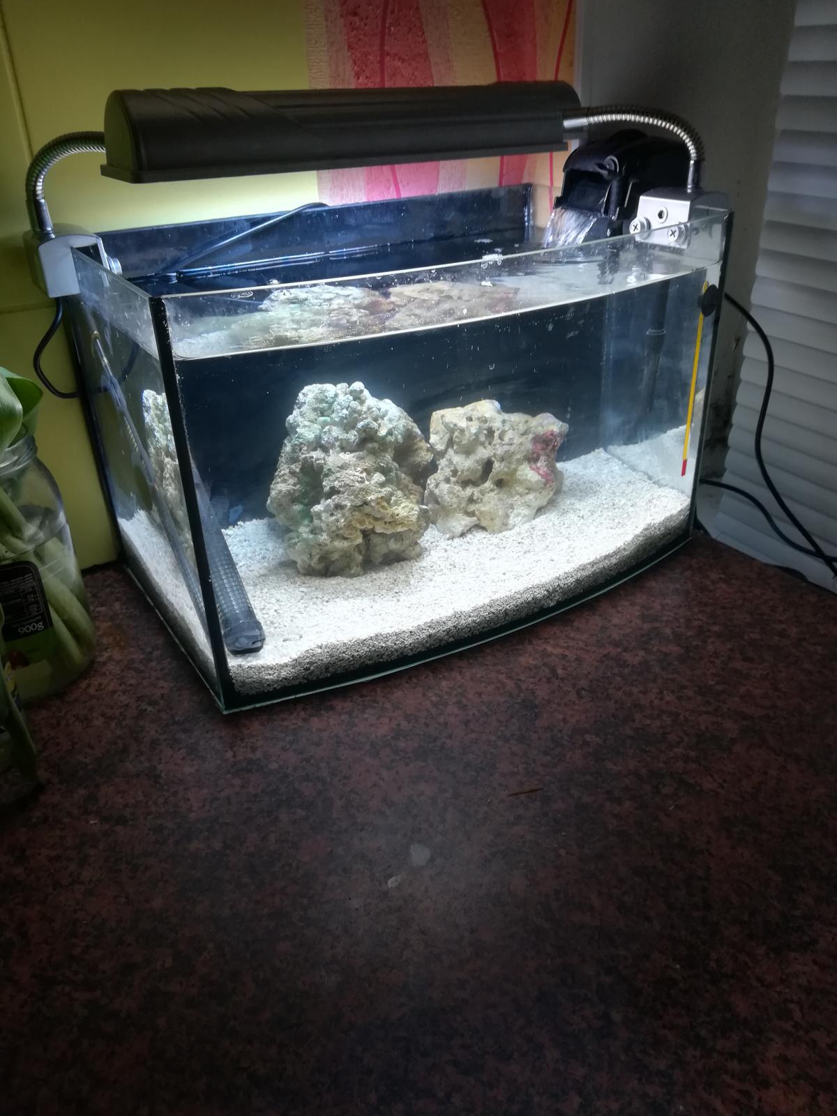 Так аквариум простоял 2 недели. Потом добавил креведку доктора,и двух улиток трохус. Пошли диатомовые водоросли. Свет включался на 8 часов.