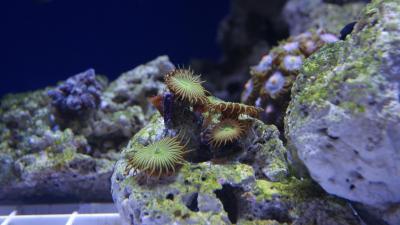 Еще немного не пойму: то ли ей не нравитсято что боковое течение от помпы слишком мощное, то ли просто полипы не хотят оаскрыться больше. Сейчас она просто налувается и открывает рты. Реснички выпустить не хочет. Кормить кстати, в самой акве не получается пока, так как плохо захватывает и слишком много корма оседает попусту-боюсь этим испортить параметры. Поэтому в акве пересаживаю ее в лоток и кормлю уже вне аквы. Потом жду пока поест и муть осядет. Затем аккуратно переношу обратно-не доставая на воздух.