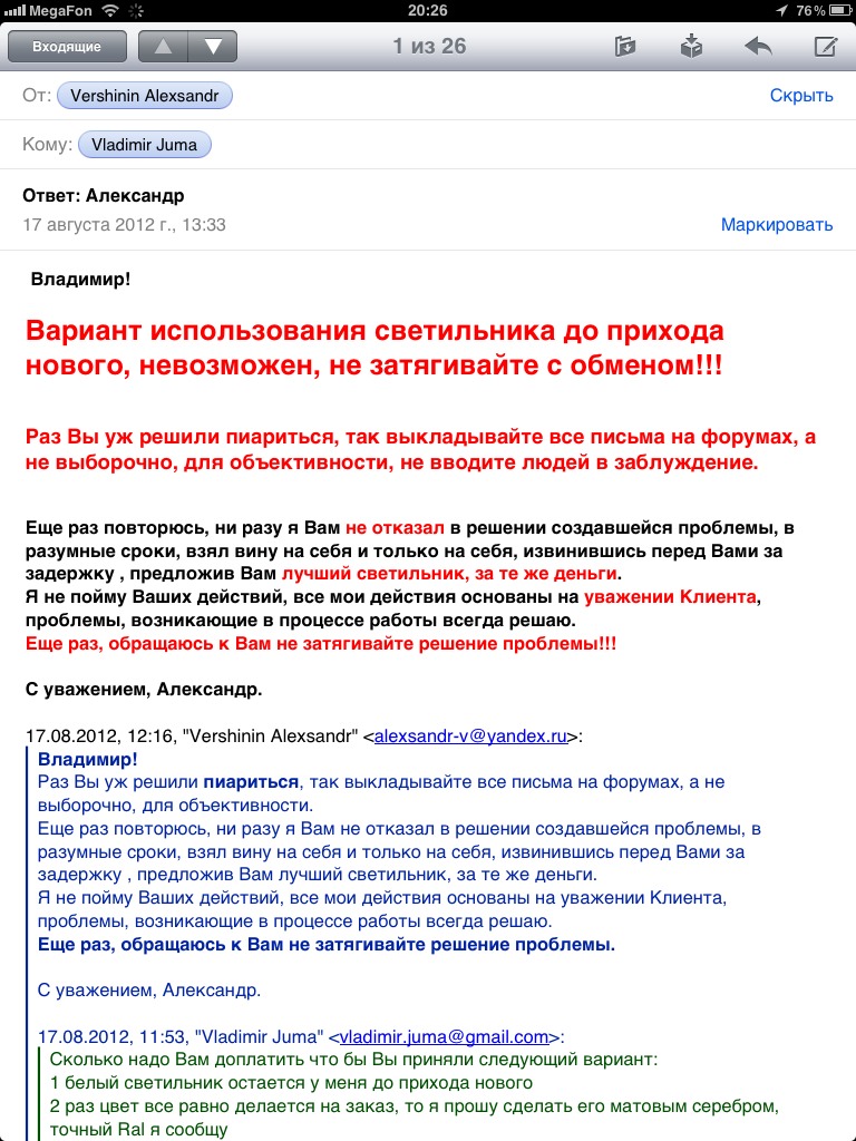 Еще раз повторюсь, ни разу я Вам не отказал в решении создавшейся проблемы, в разумные сроки, взял вину на себя и только на себя, извинившись перед Вами за задержку , предложив Вам лучший светильник, за те же деньги.