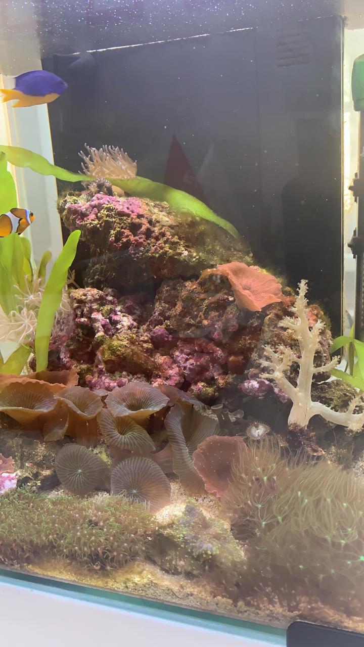 Меня зовут Алексей и я вот решился на море. Кубик 30*30*30 . запустили 28 числа на воде из действующий банки. Население 2 клоуна и креветка доктор.