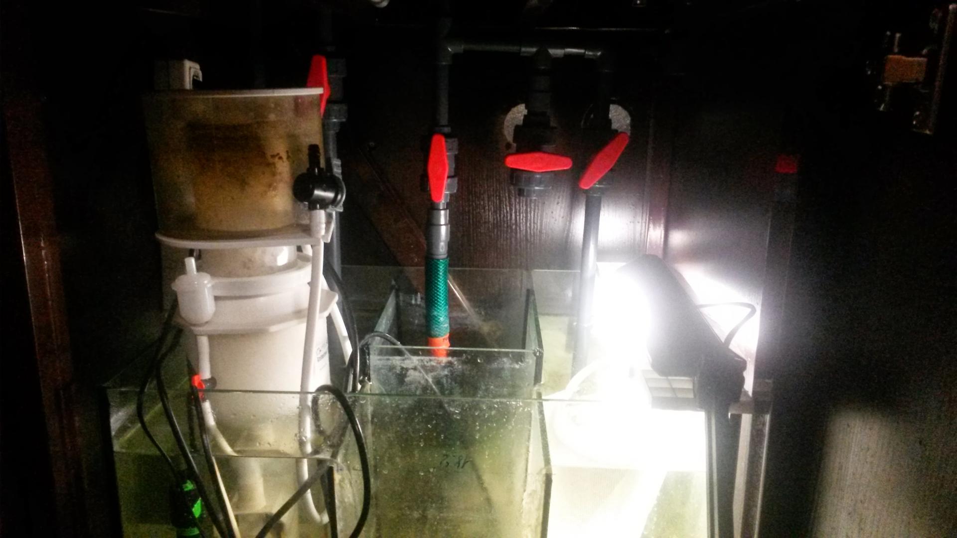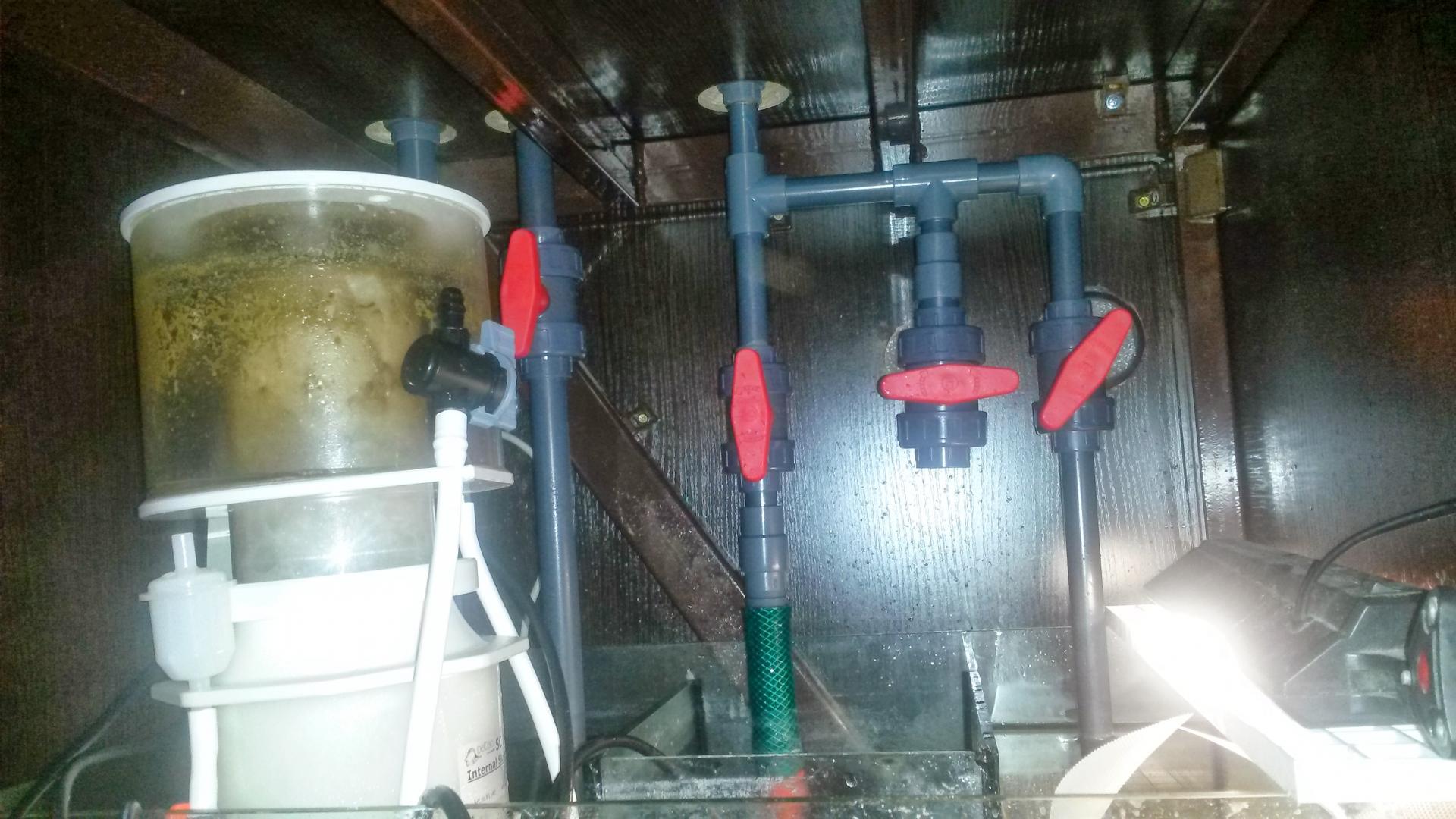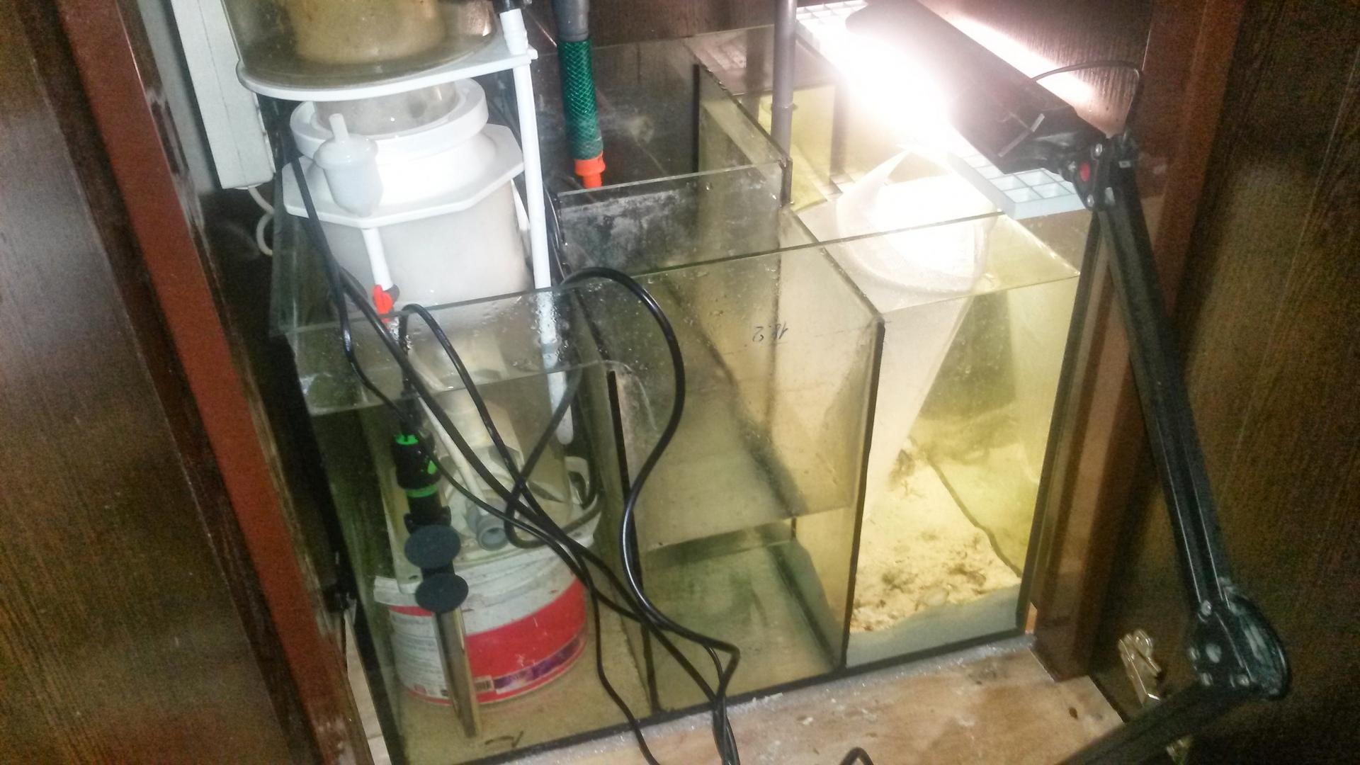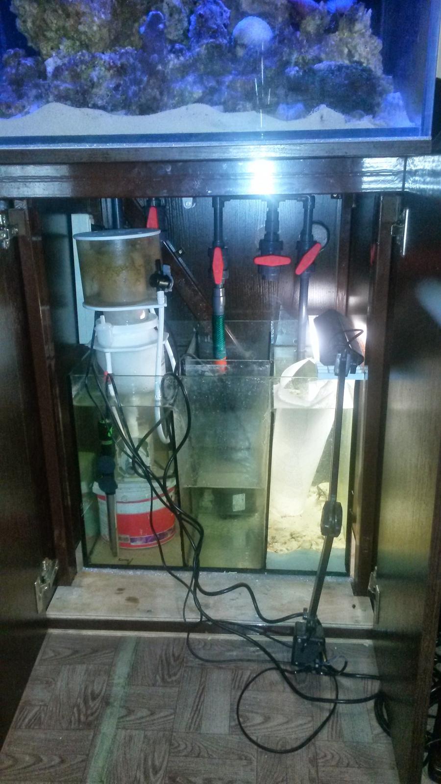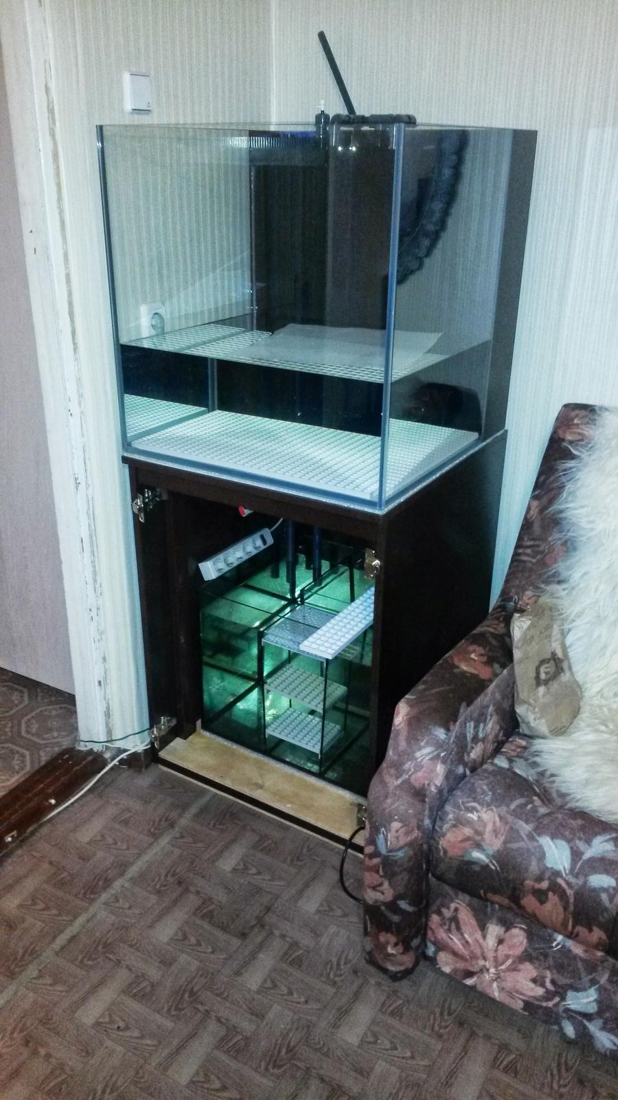 Конструктивно - куб 65х65х65см, выполненный практически полностью по чертежам Николая Sleepy https://reefcentral....ELEMENT_ID=8038. Изменил только высоту с 60 до 65, и сделал заркальное отображение чертежей, исходя из удобста обслуживания банки в месте установки, и в сампе сделал стенки чуть под наклоном, чтобы снизить шум воды.