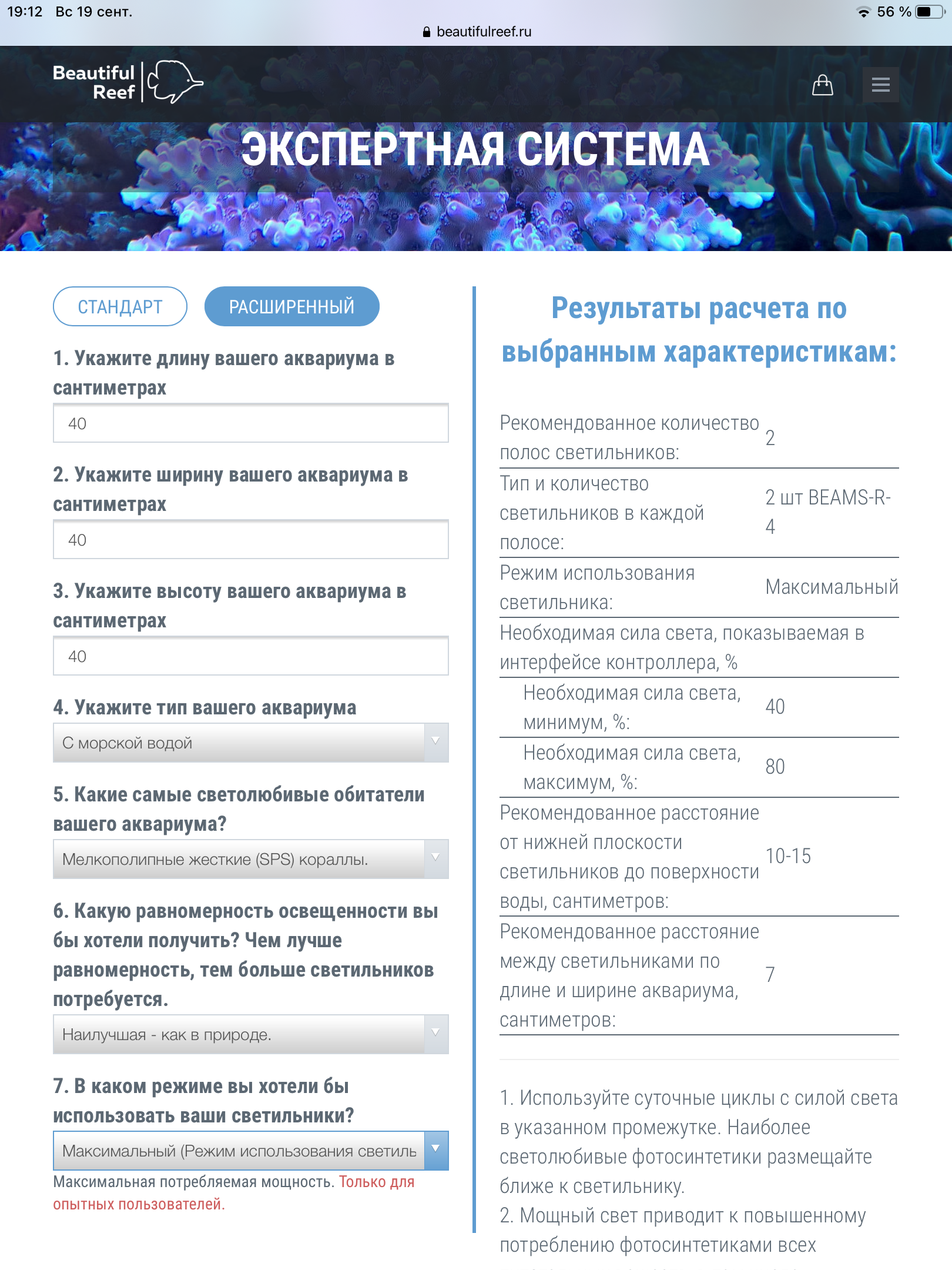Экспертная система, в расширенном режиме, с условиями освещенности как в природе на максималках выдает 2 светильникаЭкспертная система БИМС выдаёт на этот размер один светильник с любыми кораллами, просто думаю Макс решил наверняка, чтобы не возвращаться к танцам с бубном.