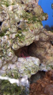 4. Актиния. Раньше жила в камне, она сама туда заползла, и в течении месяца там чахла всё больше и больше, сил смотреть на это не было, я достала её из камня, и посадила в рюмку, а рюмку закрепила так, чтобы она была в воде, но при этом максимально близко к свету. Ситуация улучшилась, актиния дуется, выглядит гораздо лучше чем в камне. Мне кажется ей не хватало света или в камне что то ей не нравилось, в целом реанимация продолжается, будем наблюдать дальше.