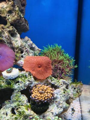 3. Дискоактинии. Выяснилось, что росло за камешком с красной дискоактинией, оказалась детка. Так как, я теперь знаю как выглядят детки дискоактиний, поделились все 3 диска, и теперь их 6)