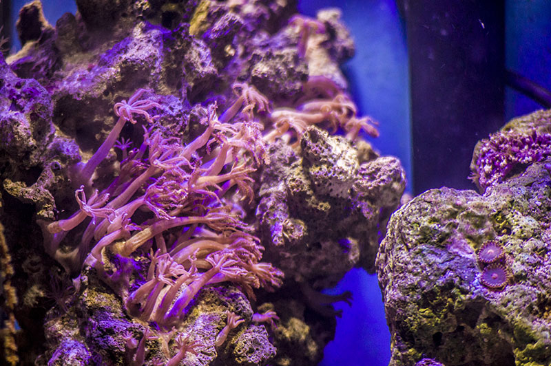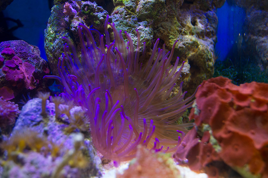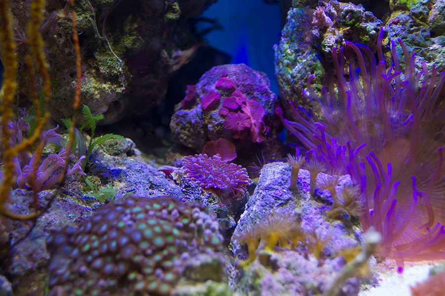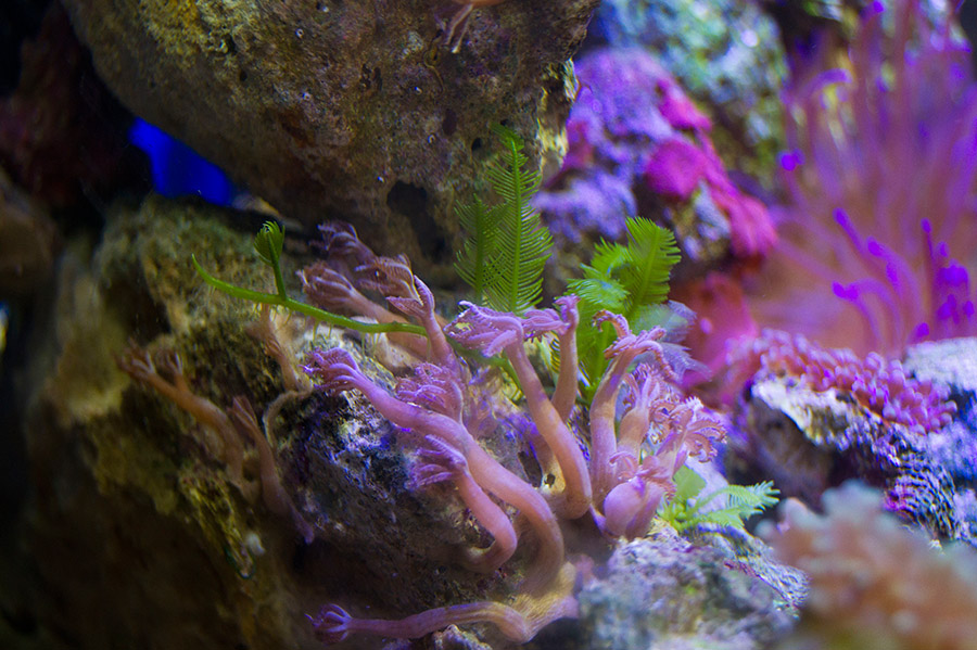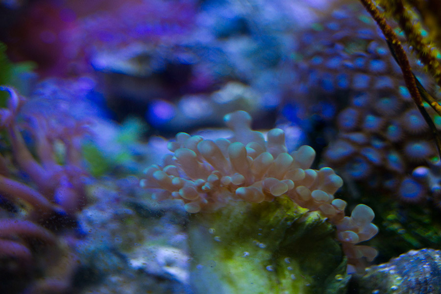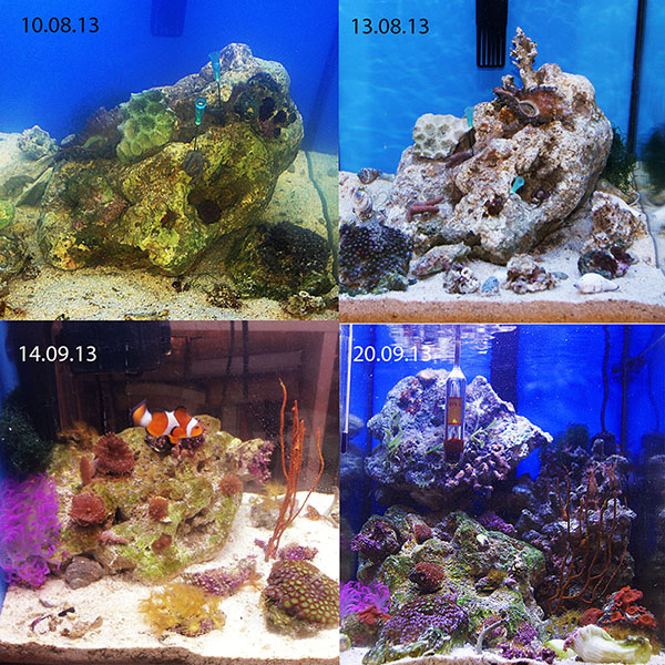Запускалась на соли Tetra и воде Шишкин лес. Через неделю активно разрослись диатомовые, и аквариум стал похож на болото. Соль сменила наTropic Marin Pro reef и ситуация резко поменялась (при подмене по 5 л 1 раз в неделю). После установки пенника resun SK-300 стало прозрачно, чисто и бедно. Было понятно, что ни населения, ни ЖК не хватает.Я приобрела актинию малу, клавулярию, горгонарию, желтые зоантусы и стромбуса у Игоря в рифшоп. Актиния до сих пор поражает мое воображение, учитывая, что я вылавливала ее в помпе, в водозаборнике фильтра и просто в укромных уголках за ЖК. Она пополнела зооаксентелами, надулась и занимает львиную долю моего аквариума.