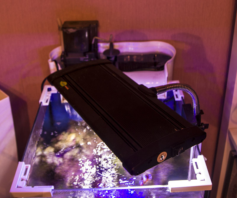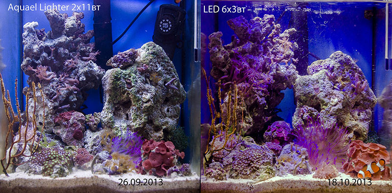 Объективно, он ярче, чем 2 на 11 вт Акваэля и дает красивый сиреневый оттенок на всю композицию ( 4 белых + 2 синих диода). В отличии от Aquael lighter, новый свет дает постоянные красивые блики от волн внешнего фильтра, картинка всегда находится в движении)