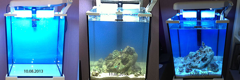 Полтора месяца перед запуском я читала этот форум и планировала свой аквариум. Начала со стандартного комплекта Aquael nano reef 30. 10 августа 4 кг ЖК, живой песок и живую воду (20% от объемма) на запуск я приобрела у Елены в JenLen. Было зелено, некрасиво, но я понимала, что лучшее впереди. Одновременно с комплектом для запуска мне досталось две рекордеи юма, два фрага синулярии, большой камень с зоантусами и улитка тубро с пучком хетаморфы. Выглядело это так: