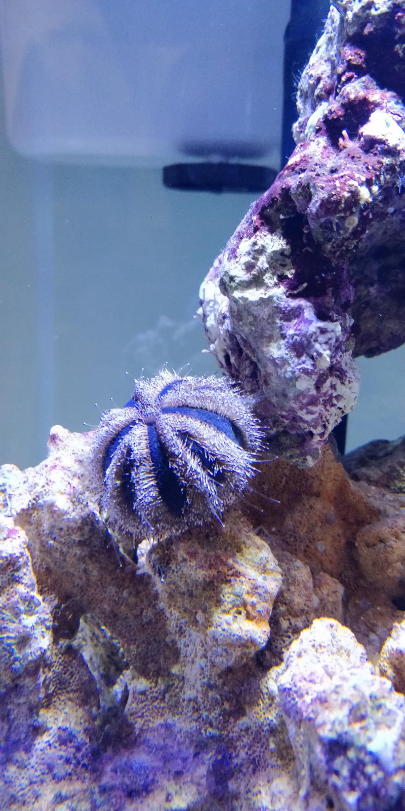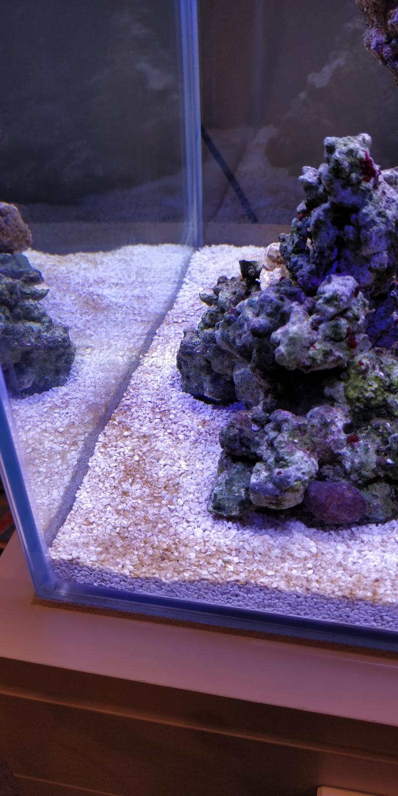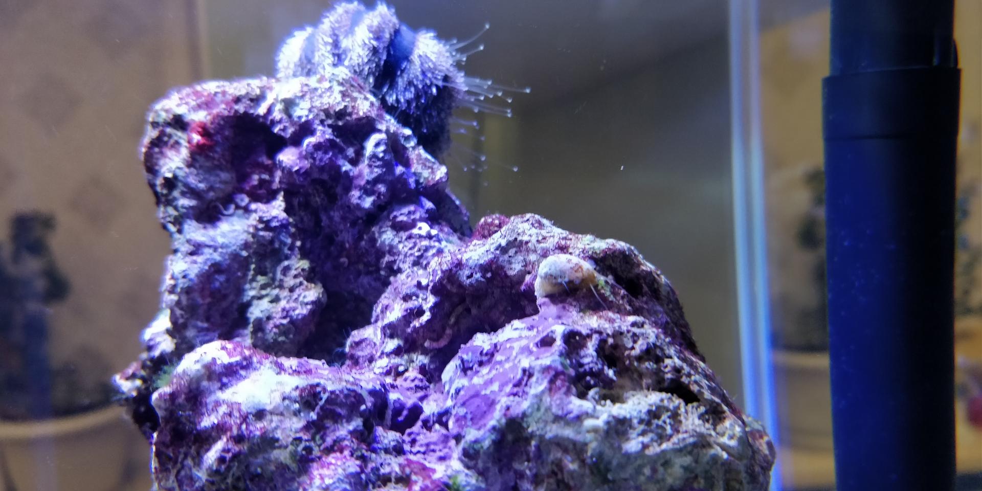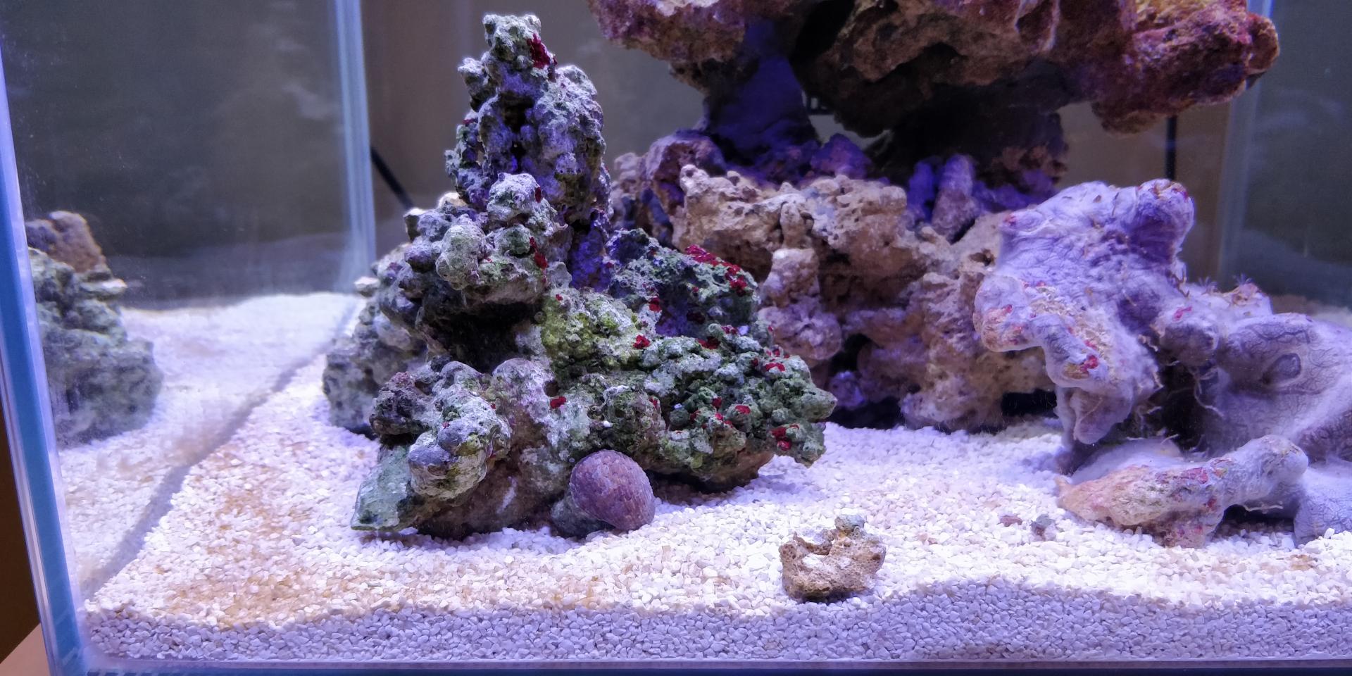 Мерил на 6-й день после старта. На камнях стали обильно появляться зеленые водоросли, песок рыжевеет. Прикупил по случаю ежика-арбузика и трех улиток Турбо. Что интересно, после запуска улиток активизировались местные улитки, приехавшие с камнями.