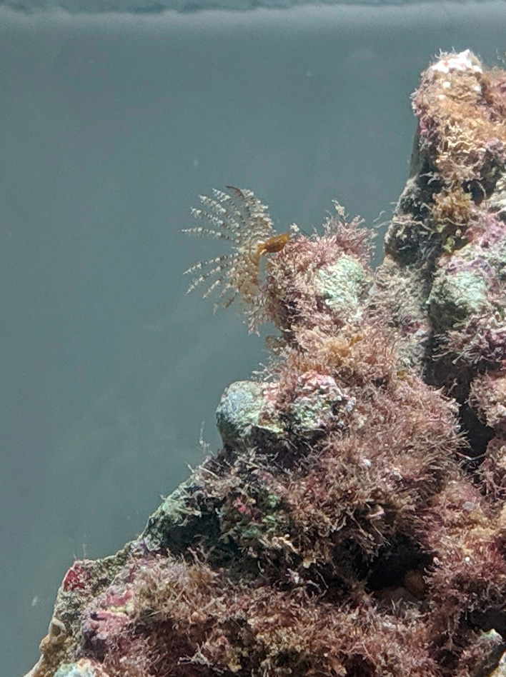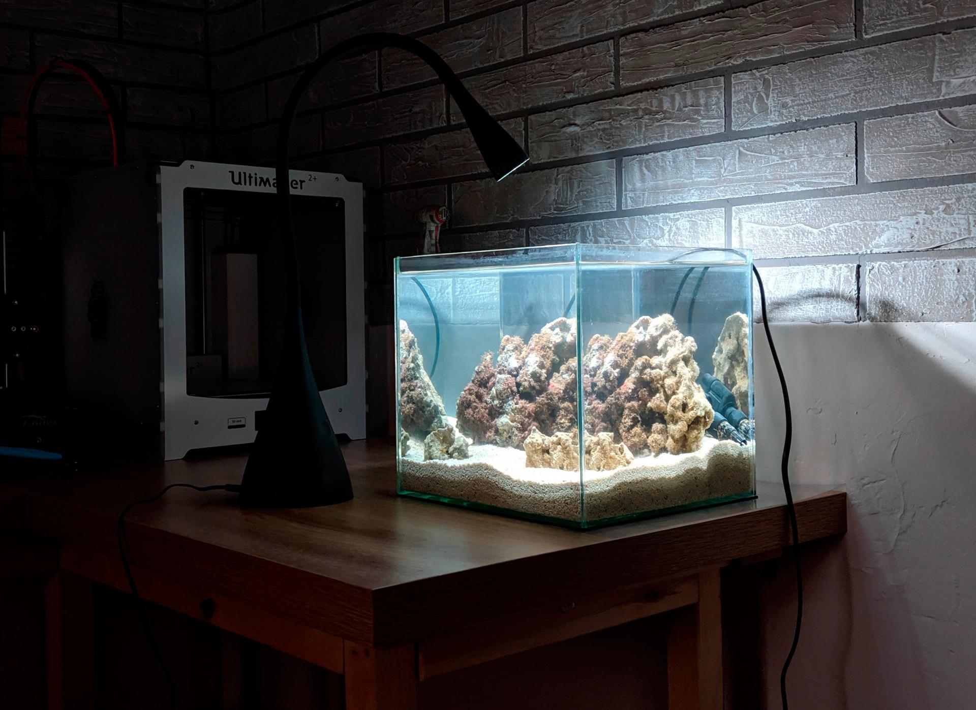 Светильник подобрал на али, пока он едет - поставил просто рабочую лампу. Ещё бросил помпу от разобранного китайского фильтра, пока она воду гоняет, позже либо заменю её на маленькую помпу течения, либо хватит потока от фильтра-рюкзачка, который тоже едет с али.