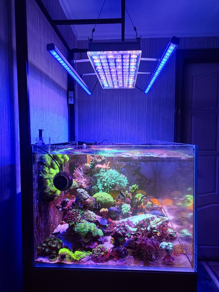 Привет. Горят и бары и синий канал на светильнике. Хватает его на эту длину, по углам получалось 50-60 пар.Привет! Имхо, не хватает основного светильника на эту длину банки - по бокам темновато, судя по второму фото.
